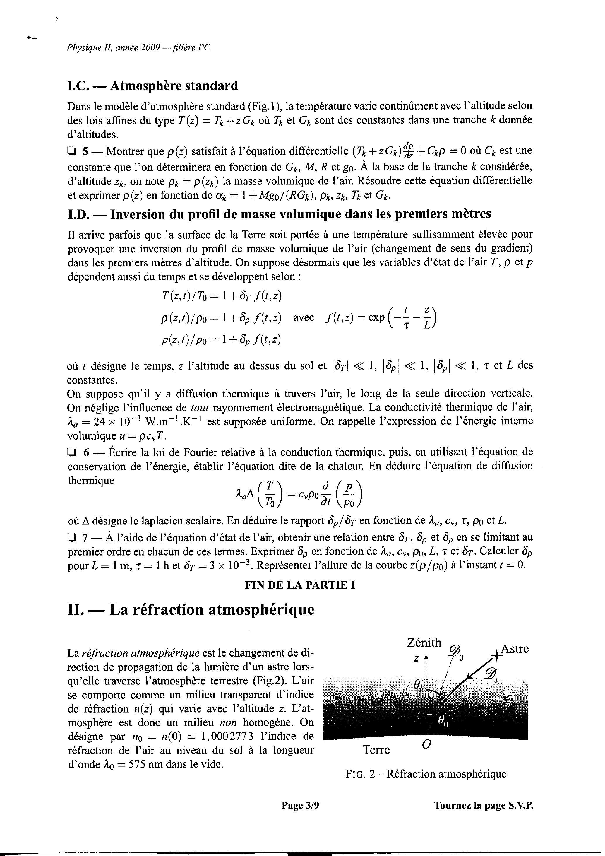 13-L'indice de réfraction de l'air est relié à la susceptibilité électrique du milieu, supposée réelle, par la relation . Sachant que est proportionnelle à , montrer que et sont approximativement en relation affine. Exprimer en fonction de et la masse volumique à l'altitude . En déduire sous forme d'une intégrale sur la variable , en fonction de , . On précisera les bornes d'intégration.