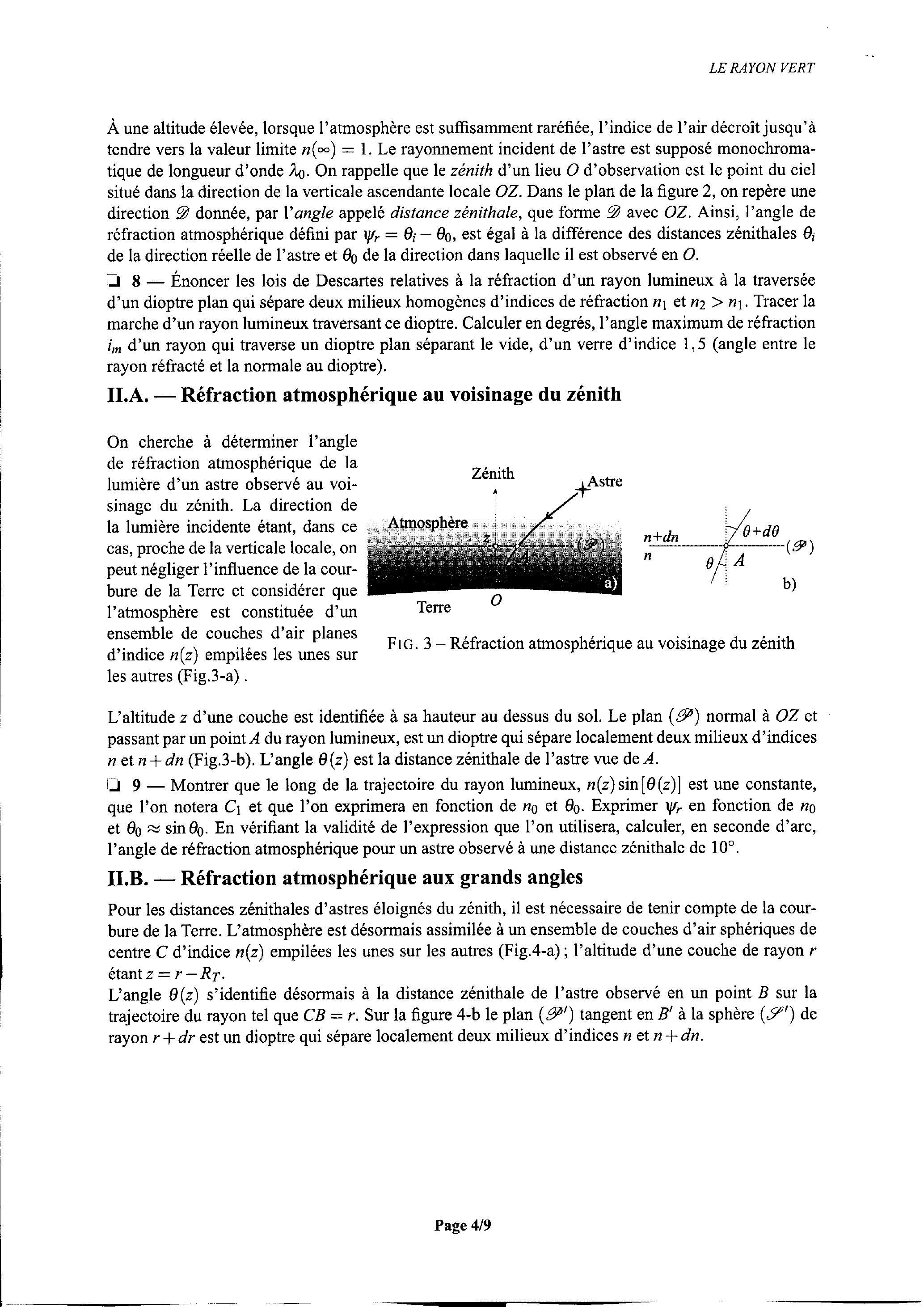 L'altitude d'une couche est identifiée à sa hauteur au dessus du sol. Le plan ( ) normal à et passant par un point du rayon lumineux, est un dioptre qui sépare localement deux milieux d'indices et (Fig.3-b). L'angle est la distance zénithale de l'astre vue de . - Montrer que le long de la trajectoire du rayon lumineux, est une constante, que l'on notera et que l'on exprimera en fonction de et . Exprimer en fonction de et . En vérifiant la validité de l'expression que l'on utilisera, calculer, en seconde d'arc, l'angle de réfraction atmosphérique pour un astre observé à une distance zénithale de .