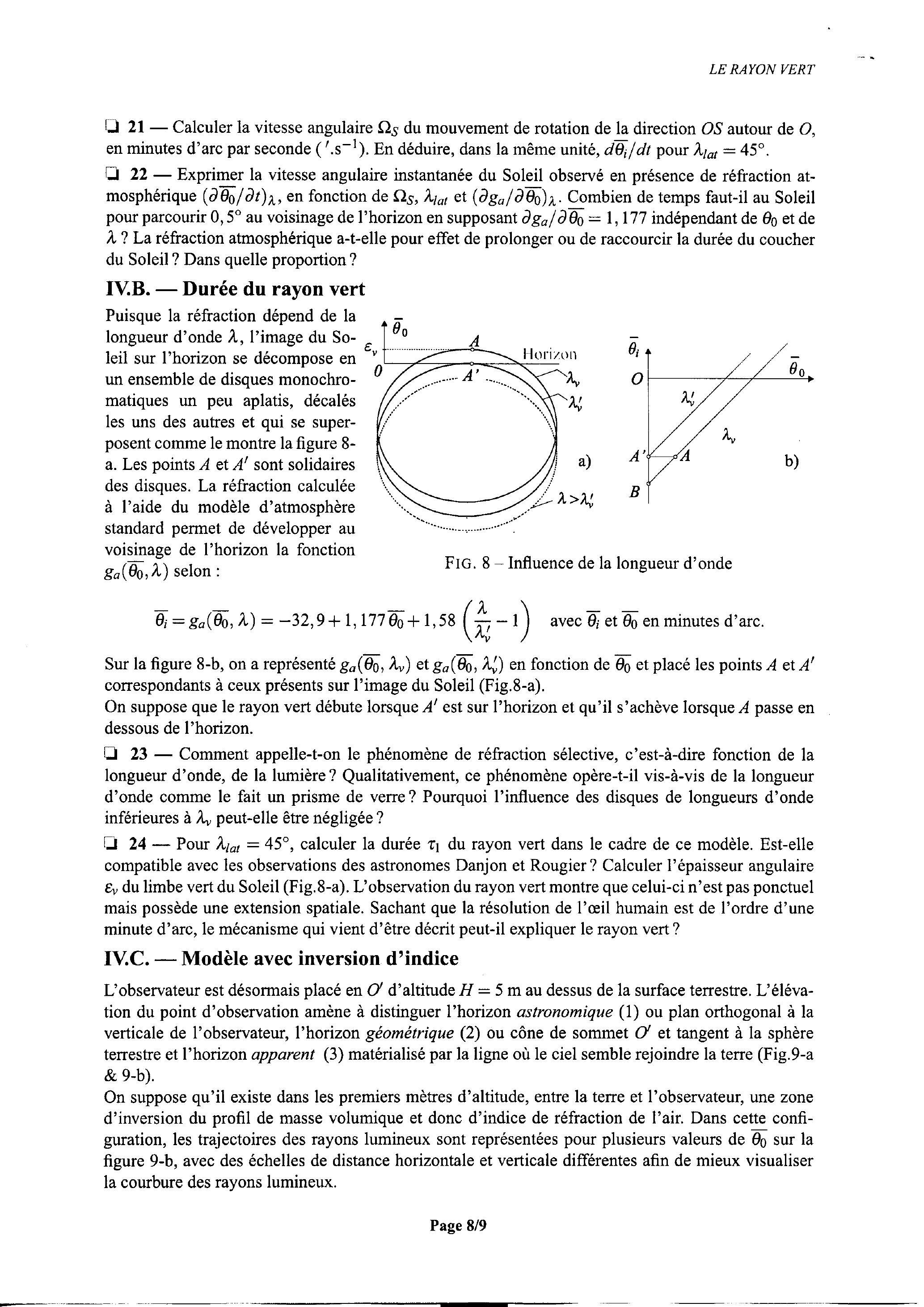 I 24 - Pour , calculer la durée du rayon vert dans le cadre de ce modèle. Est-elle compatible avec les observations des astronomes Danjon et Rougier? Calculer l'épaisseur angulaire du limbe vert du Soleil (Fig.8-a). L'observation du rayon vert montre que celui-ci n'est pas ponctuel mais possède une extension spatiale. Sachant que la résolution de l'œil humain est de l'ordre d'une minute d'arc, le mécanisme qui vient d'être décrit peut-il expliquer le rayon vert?