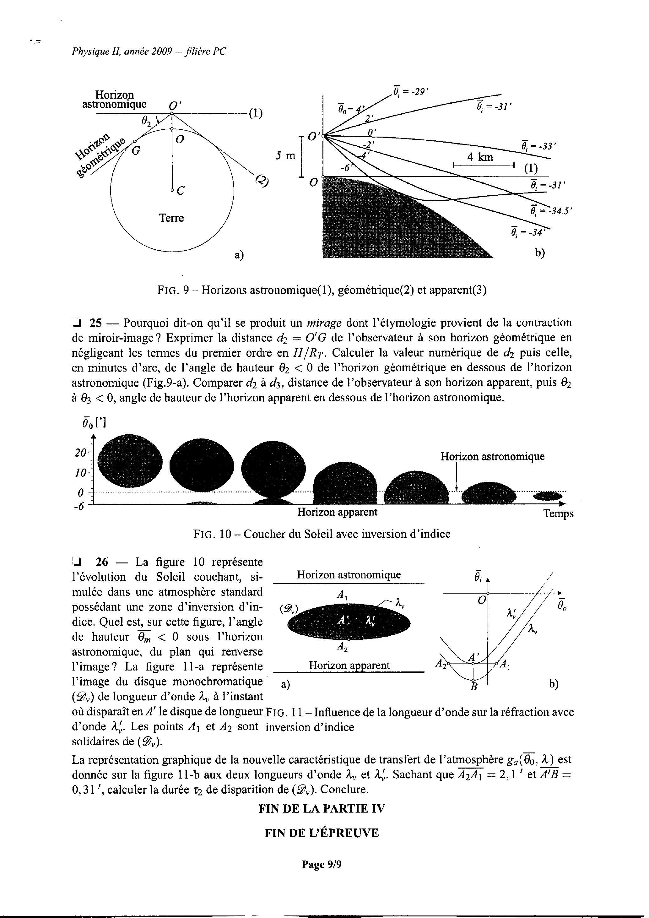 [] 25 - Pourquoi dit-on qu'il se produit un mirage dont l'étymologie provient de la contraction de miroir-image ? Exprimer la distance de l'observateur à son horizon géométrique en négligeant les termes du premier ordre en . Calculer la valeur numérique de puis celle, en minutes d'arc, de l'angle de hauteur de l'horizon géométrique en dessous de l'horizon astronomique (Fig.9-a). Comparer à , distance de l'observateur à son horizon apparent, puis à , angle de hauteur de l'horizon apparent en dessous de l'horizon astronomique.