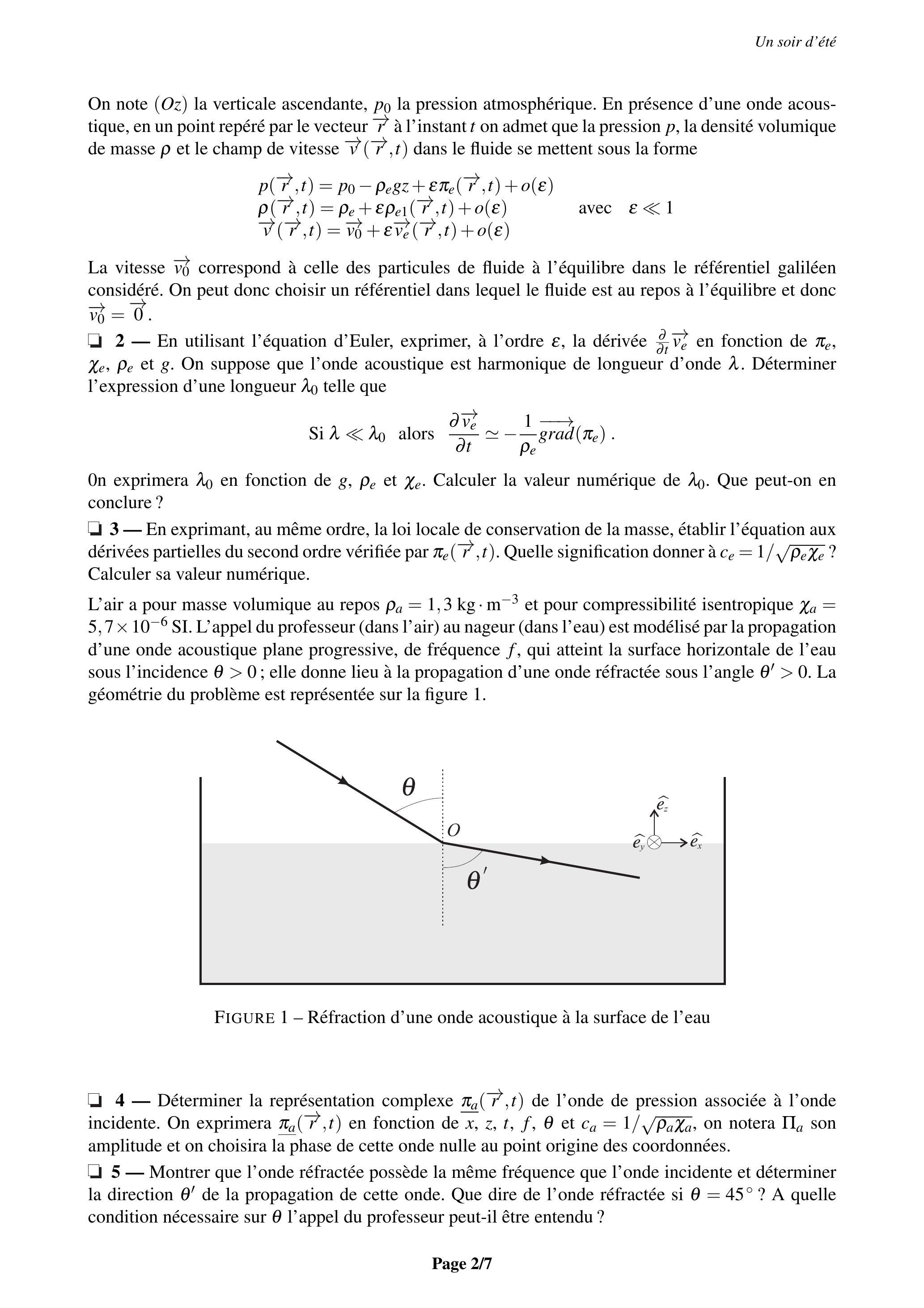 L'air a pour masse volumique au repos et pour compressibilité isentropique SI. L'appel du professeur (dans l'air) au nageur (dans l'eau) est modélisé par la propagation d'une onde acoustique plane progressive, de fréquence , qui atteint la surface horizontale de l'eau sous l'incidence ; elle donne lieu à la propagation d'une onde réfractée sous l'angle . La géométrie du problème est représentée sur la figure 1 .