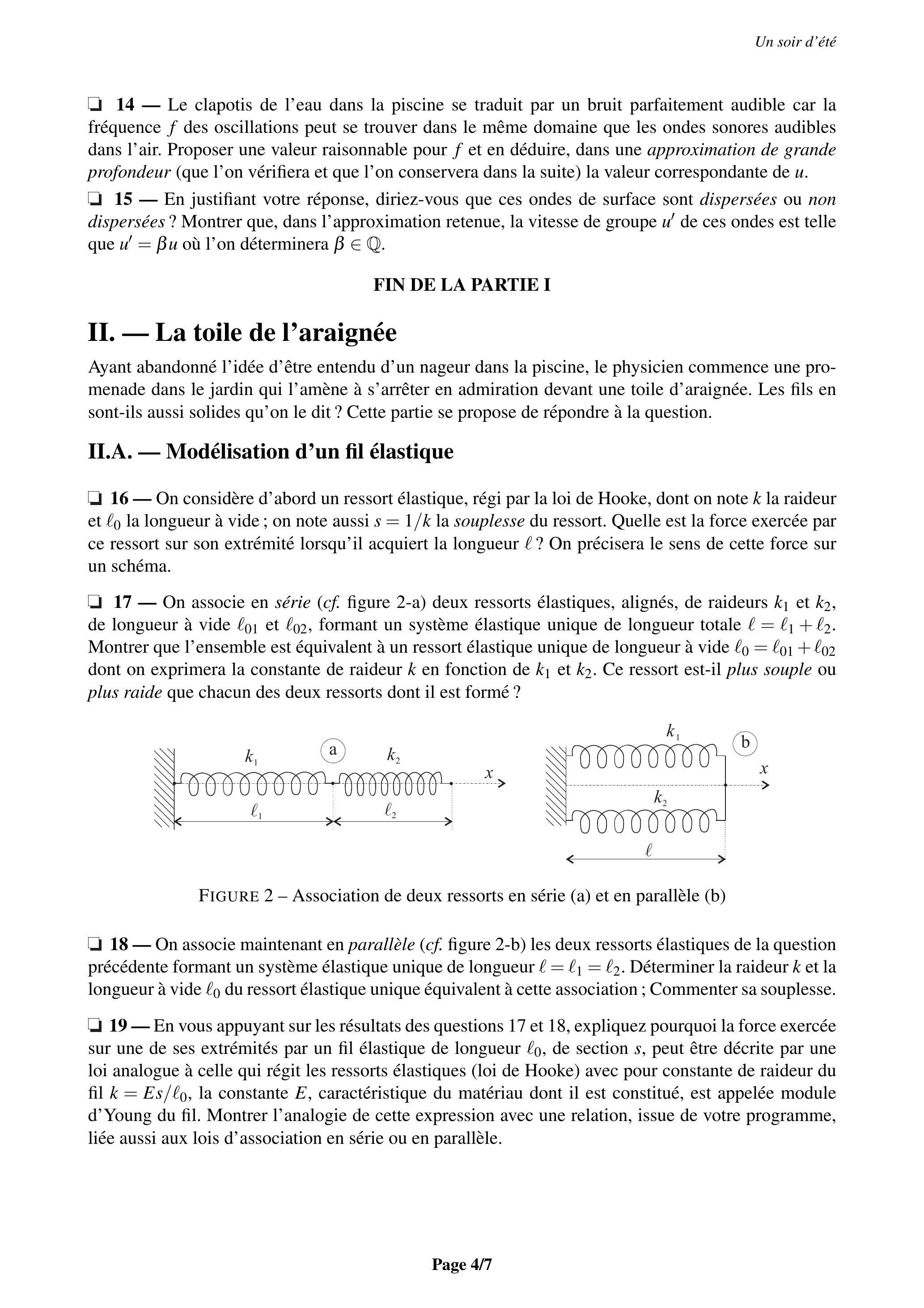 - On associe maintenant en parallèle (cf. figure 2-b) les deux ressorts élastiques de la question précédente formant un système élastique unique de longueur . Déterminer la raideur et la longueur à vide du ressort élastique unique équivalent à cette association; Commenter sa souplesse.