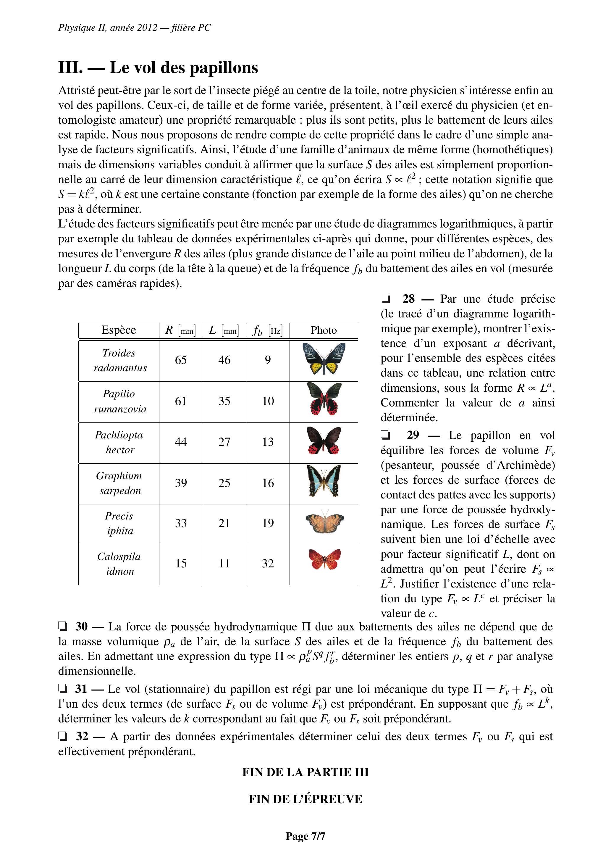 • 29 - Le papillon en vol équilibre les forces de volume (pesanteur, poussée d'Archimède) et les forces de surface (forces de contact des pattes avec les supports) par une force de poussée hydrodynamique. Les forces de surface suivent bien une loi d'échelle avec pour facteur significatif , dont on admettra qu'on peut l'écrire . Justifier l'existence d'une relation du type et préciser la valeur de .