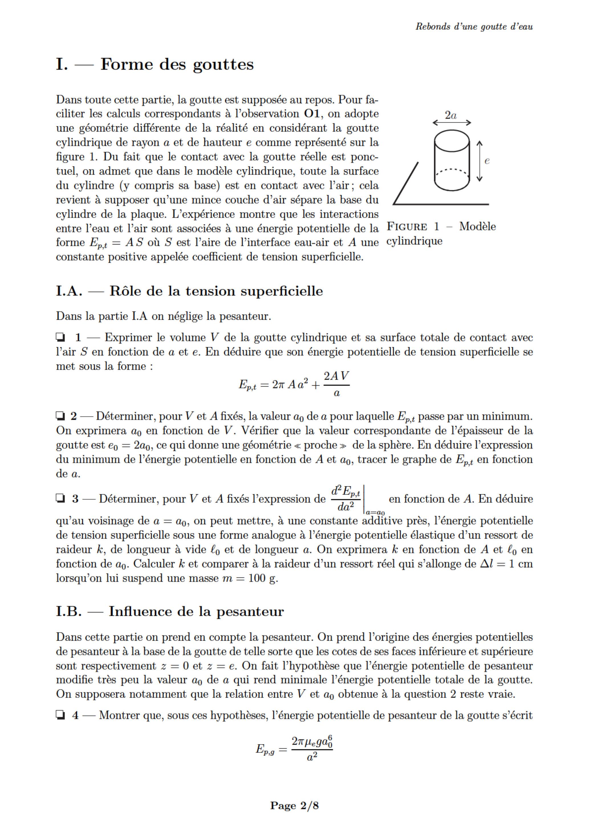 1 - Exprimer le volume de la goutte cylindrique et sa surface totale de contact avec l'air en fonction de et . En déduire que son énergie potentielle de tension superficielle se met sous la forme :