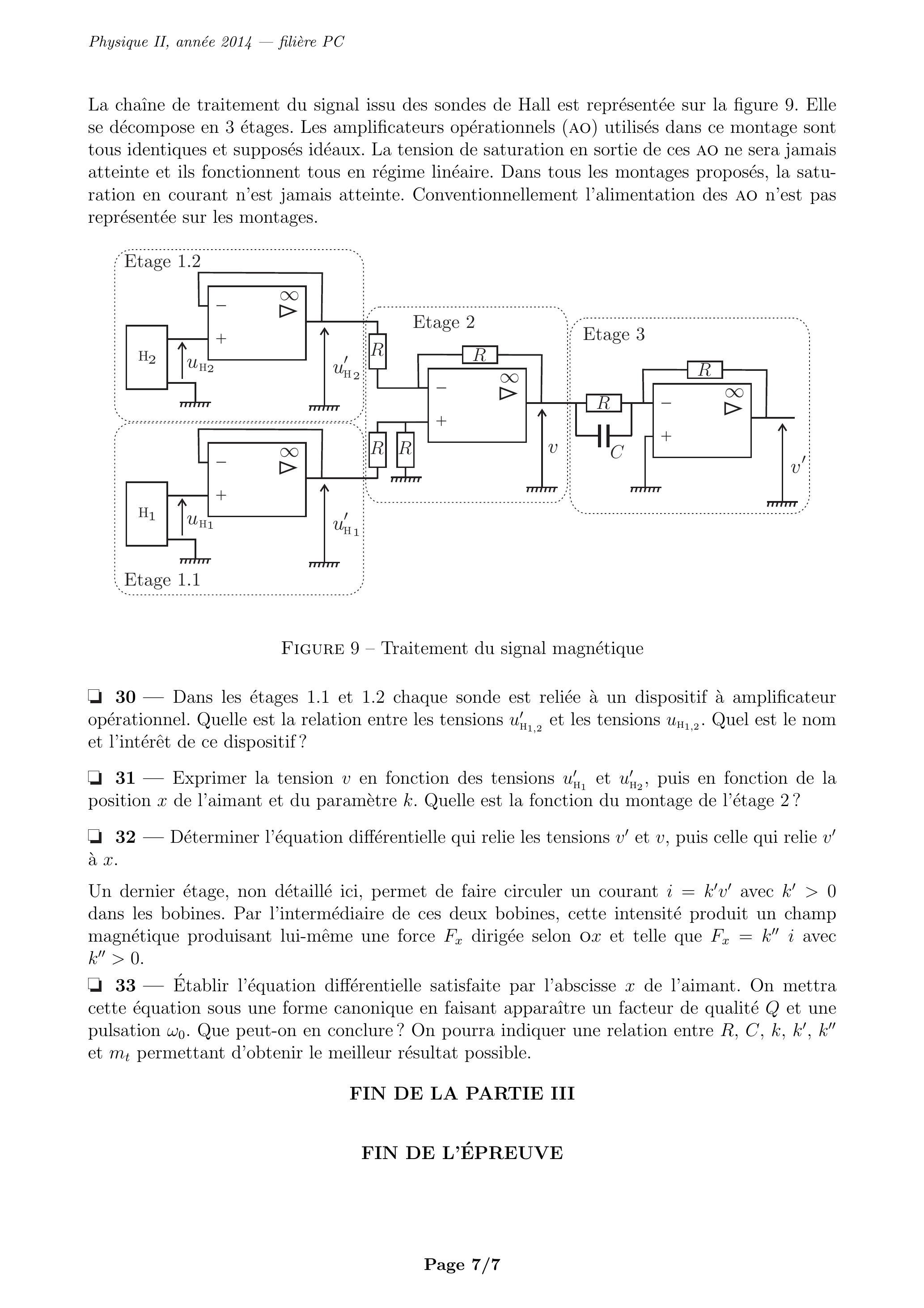 - Exprimer la tension en fonction des tensions et , puis en fonction de la position de l'aimant et du paramètre . Quelle est la fonction du montage de l'étage 2 ?