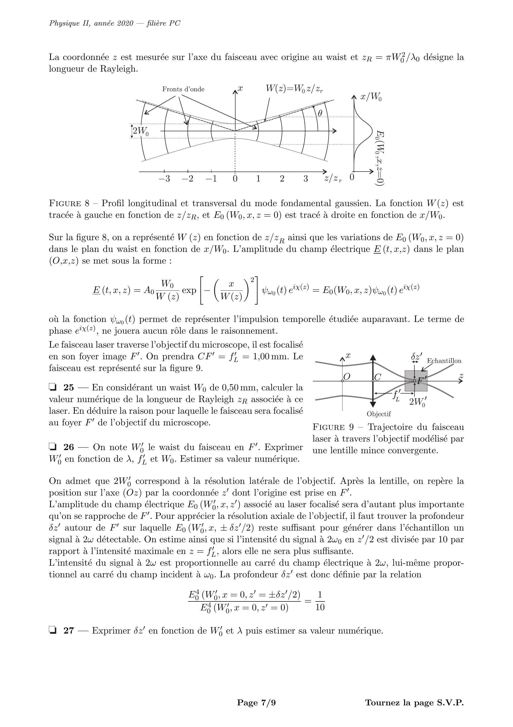 Le faisceau laser traverse l'objectif du microscope, il est focalisé en son foyer image . On prendra . Le faisceau est représenté sur la figure 9. - En considérant un waist de , calculer la valeur numérique de la longueur de Rayleigh associée à ce laser. En déduire la raison pour laquelle le faisceau sera focalisé au foyer de l'objectif du microscope. - On note le waist du faisceau en . Exprimer en fonction de et . Estimer sa valeur numérique.