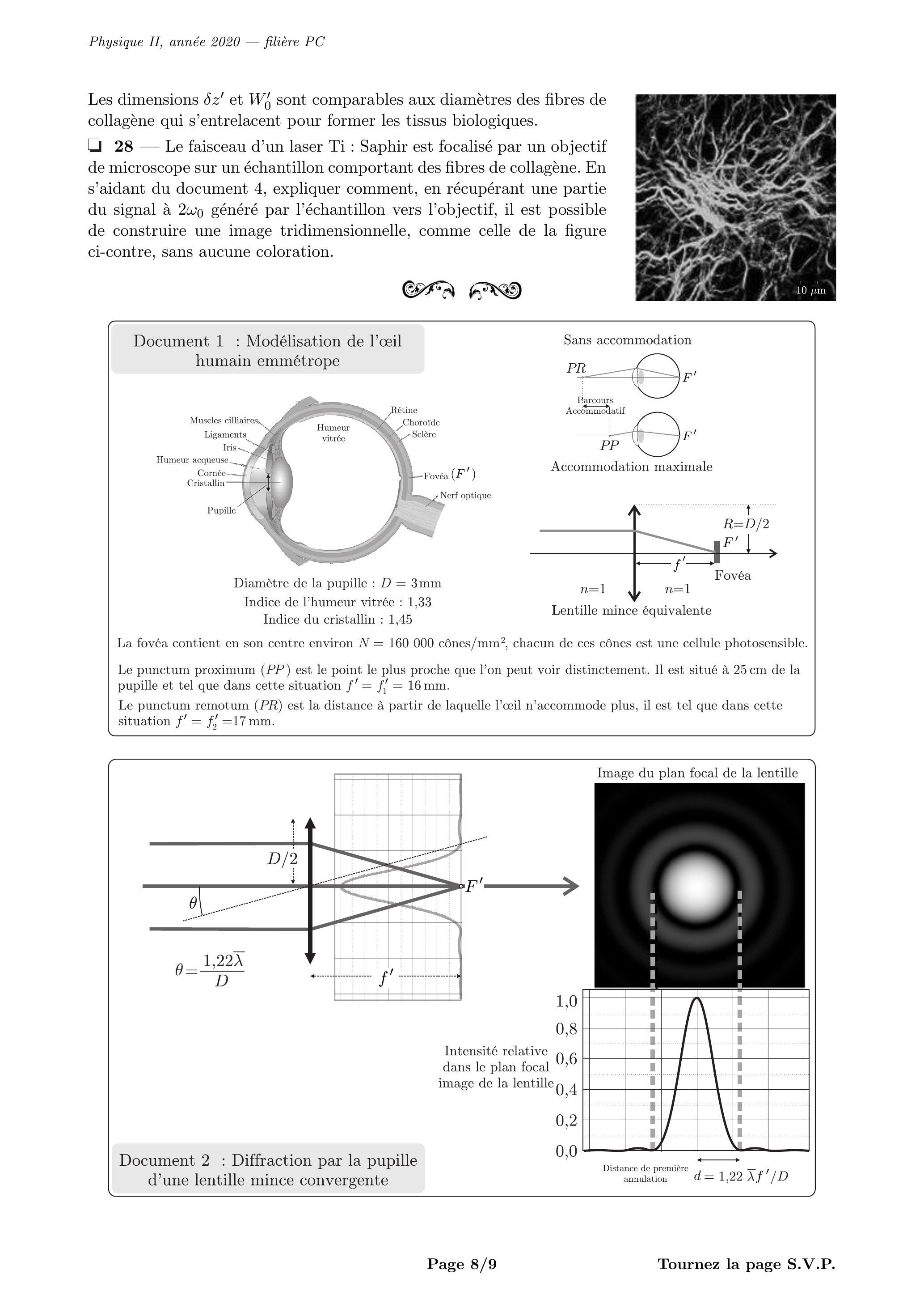 L'œil peut être modélisé par une lentille mince convergente de distance focale variable placée dans l'air, d'indice et de diamètre , identique à celui de la pupille d'entrée de l'œil. On désigne par la longueur d'onde moyenne du rayonnement visible égale à 500 nm .