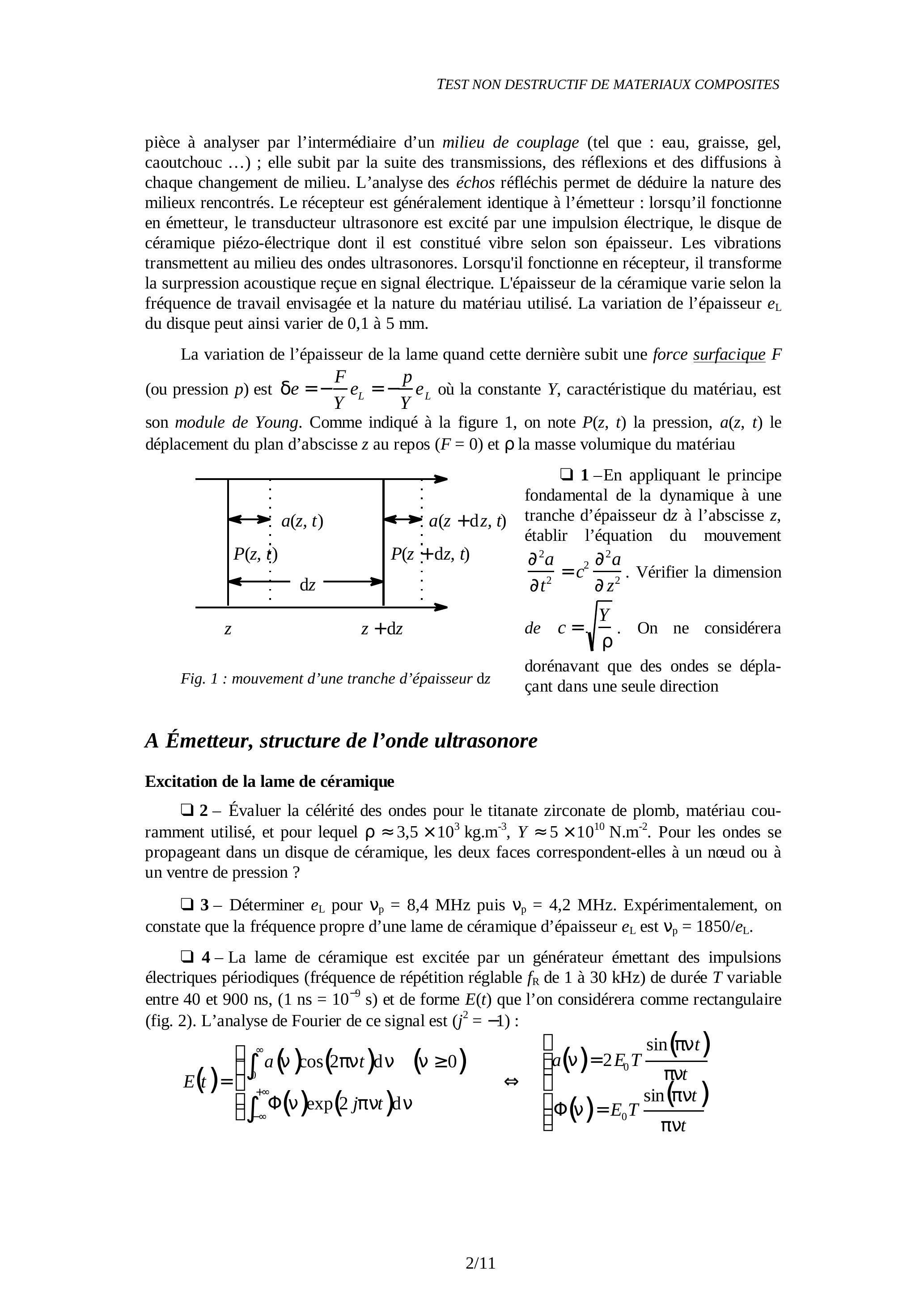-En appliquant le principe fondamental de la dynamique à une tranche d'épaisseur dz à l'abscisse , établir l'équation du mouvement . Vérifier la dimension de . On ne considérera dorénavant que des ondes se déplaçant dans une seule direction