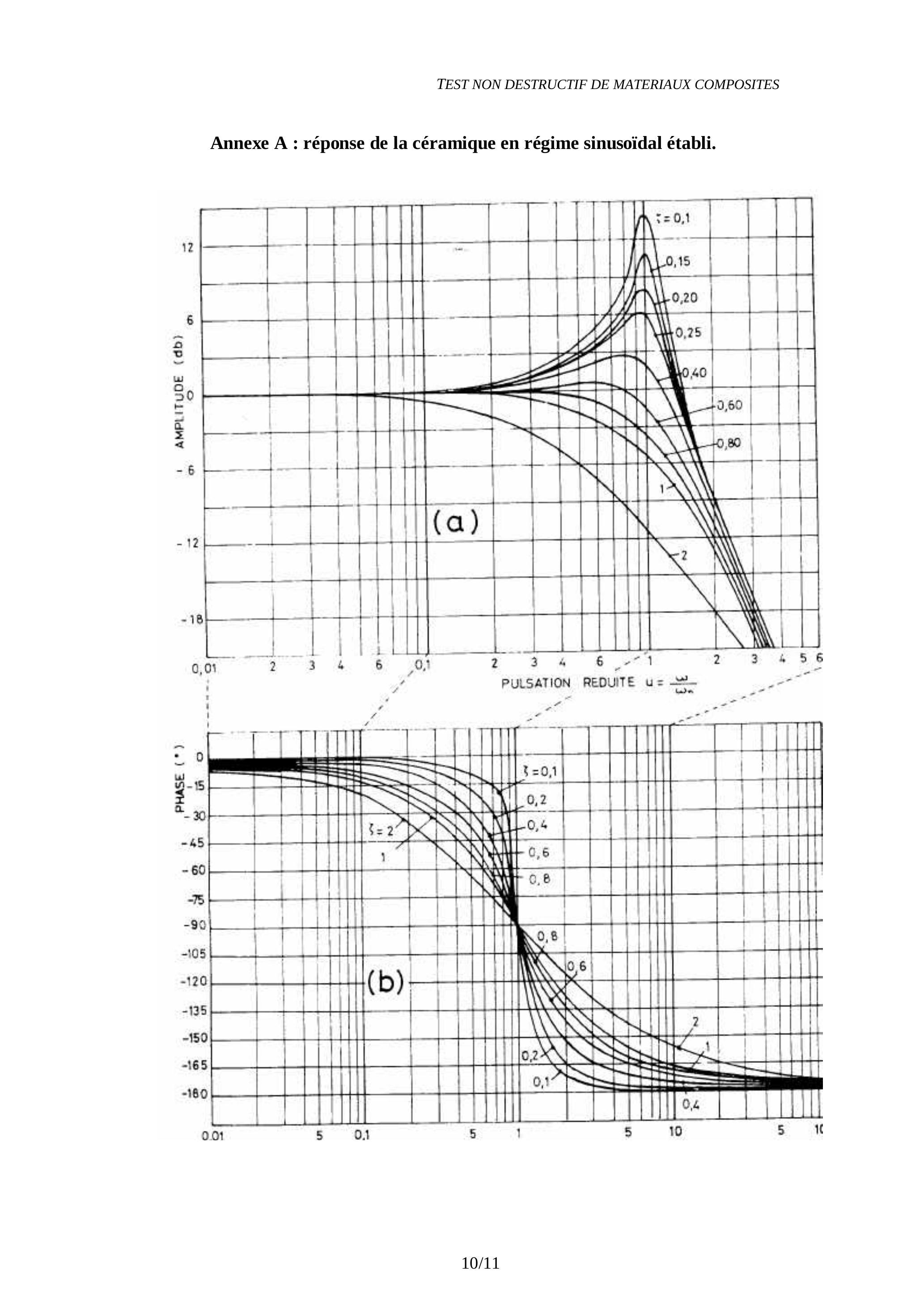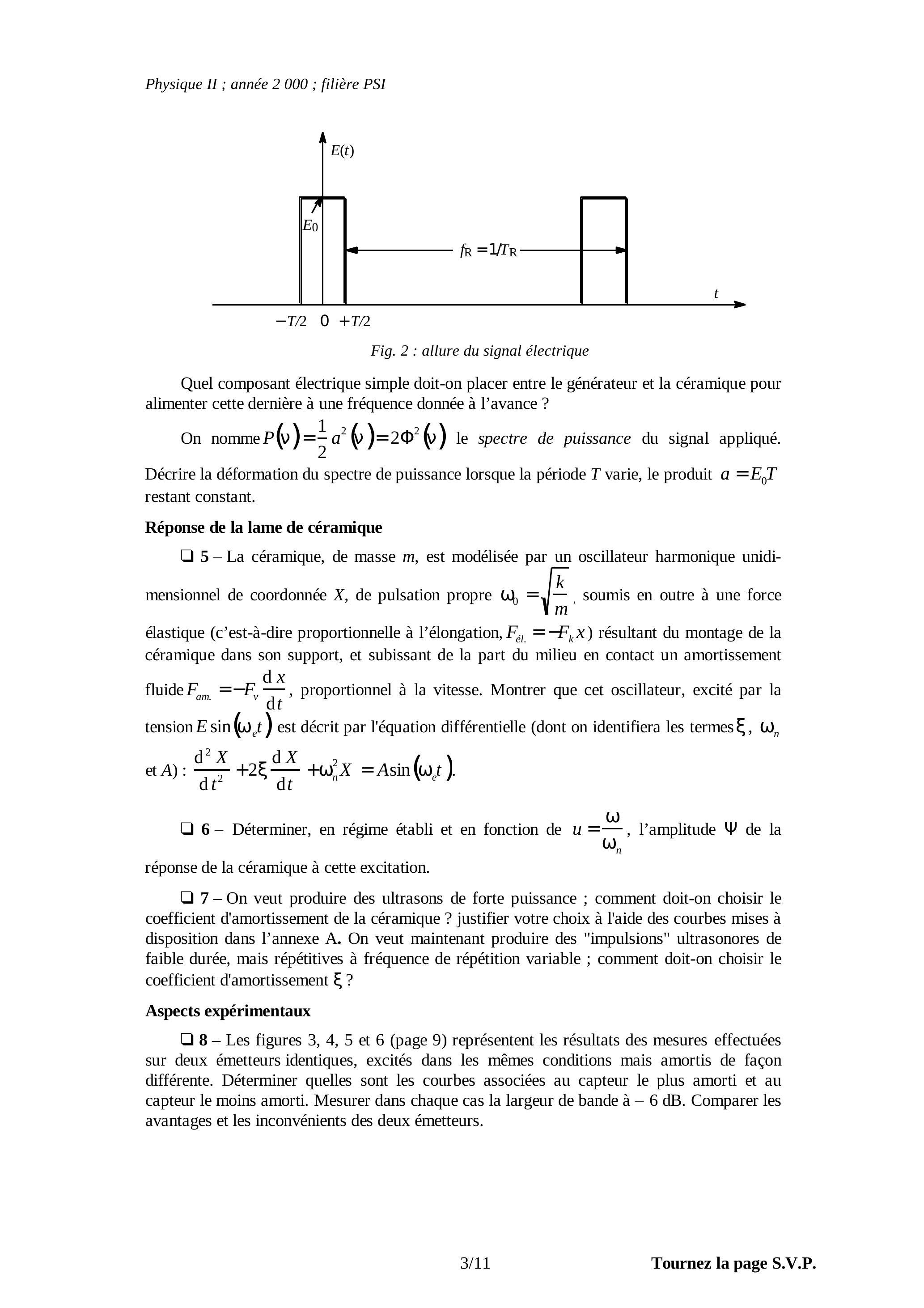 - La céramique, de masse , est modélisée par un oscillateur harmonique unidimensionnel de coordonnée , de pulsation propre , soumis en outre à une force élastique (c'est-à-dire proportionnelle à l'élongation, ) résultant du montage de la céramique dans son support, et subissant de la part du milieu en contact un amortissement fluide , proportionnel à la vitesse. Montrer que cet oscillateur, excité par la tension est décrit par l'équation différentielle (dont on identifiera les termes , et . - Déterminer, en régime établi et en fonction de , l'amplitude de la réponse de la céramique à cette excitation. - On veut produire des ultrasons de forte puissance ; comment doit-on choisir le coefficient d'amortissement de la céramique ? justifier votre choix à l'aide des courbes mises à disposition dans l'annexe A. On veut maintenant produire des "impulsions" ultrasonores de faible durée, mais répétitives à fréquence de répétition variable ; comment doit-on choisir le coefficient d'amortissement ?