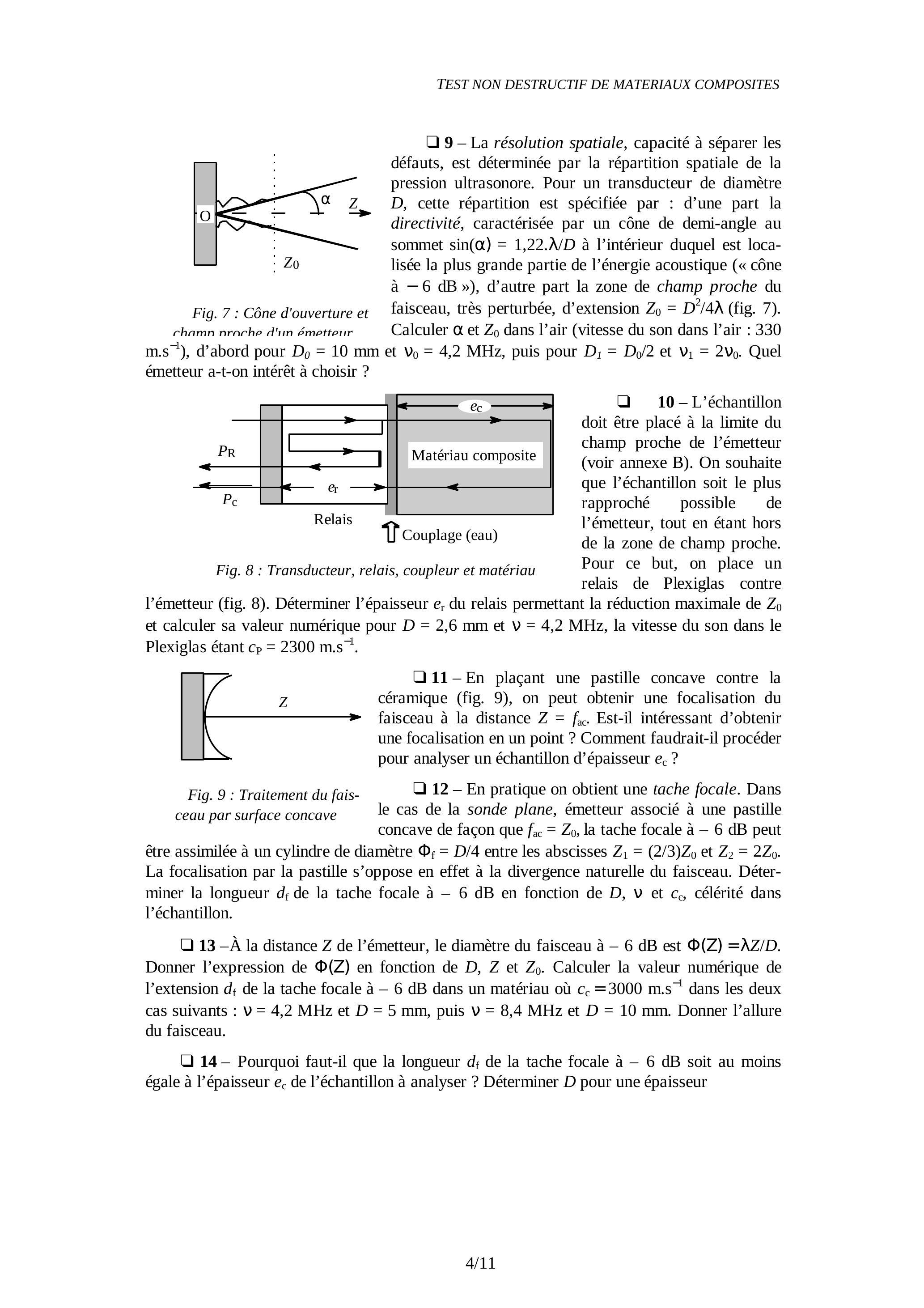 défauts, est déterminée par la répartition spatiale de la pression ultrasonore. Pour un transducteur de diamètre , cette répartition est spécifiée par : d'une part la directivité, caractérisée par un cône de demi-angle au sommet à l'intérieur duquel est localisée la plus grande partie de l’énergie acoustique («cône à -6 dB »), d'autre part la zone de champ proche du faisceau, très perturbée, d'extension (fig. 7). Calculer et dans l'air (vitesse du son dans l'air : 330 ), d'abord pour et , puis pour et . Quel émetteur a-t-on intérêt à choisir ?