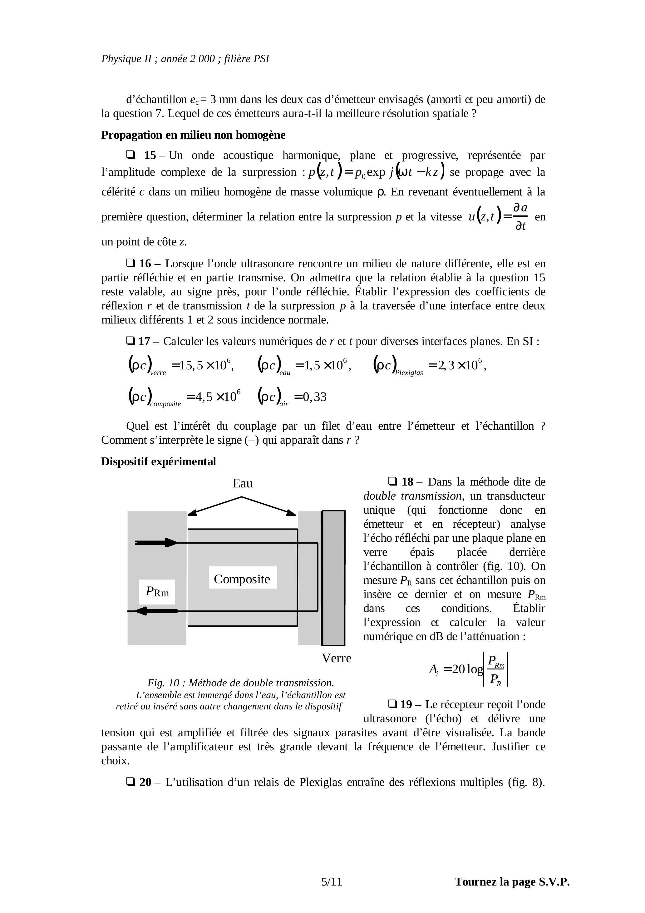 18 - Dans la méthode dite de double transmission, un transducteur unique (qui fonctionne donc en émetteur et en récepteur) analyse l'écho réfléchi par une plaque plane en verre épais placée derrière l'échantillon à contrôler (fig. 10). On mesure sans cet échantillon puis on insère ce dernier et on mesure dans ces conditions. Établir l'expression et calculer la valeur numérique en dB de l'atténuation :