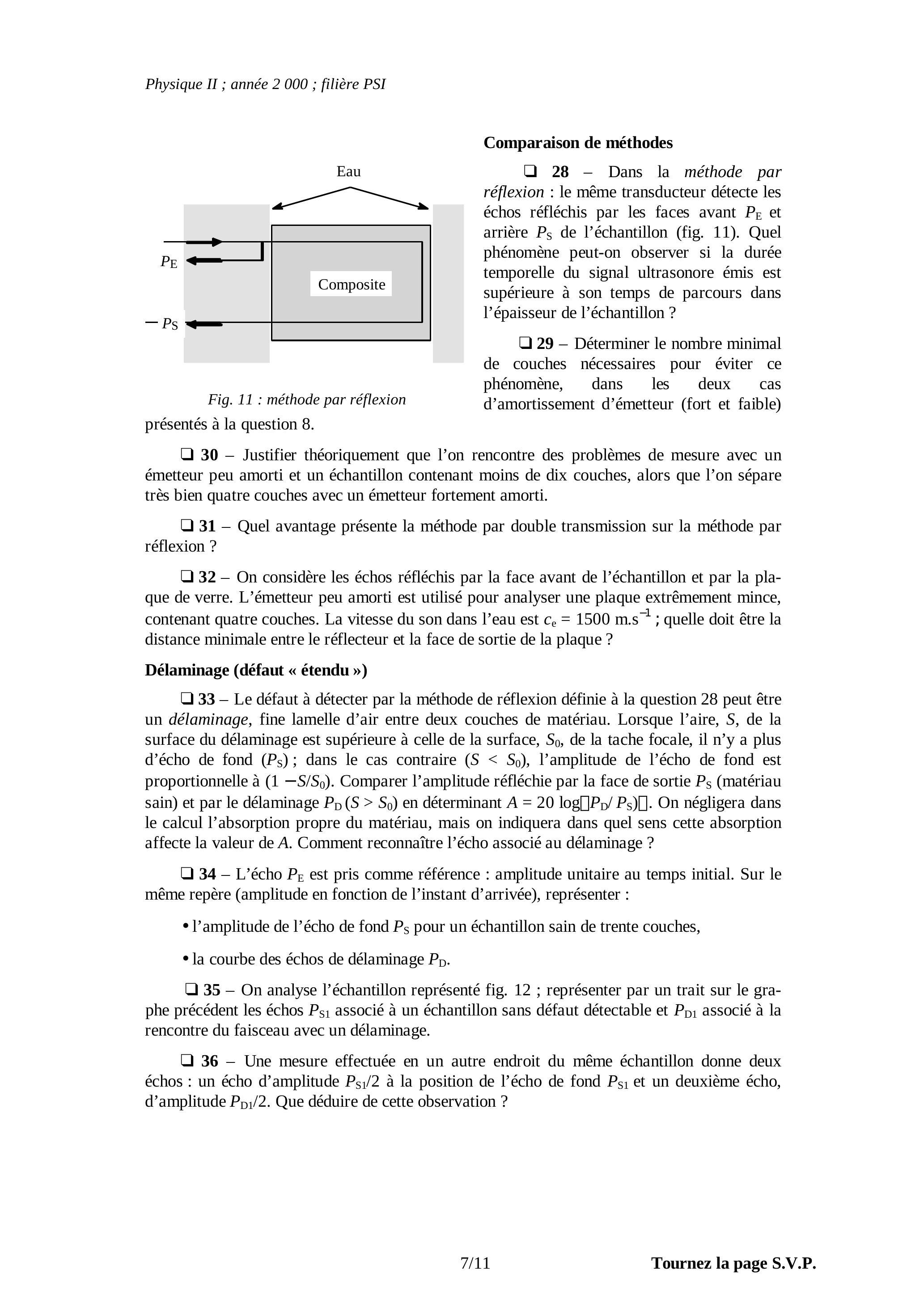 29 - Déterminer le nombre minimal de couches nécessaires pour éviter ce phénomène, dans les deux cas d'amortissement d'émetteur (fort et faible) présentés à la question 8 . - Justifier théoriquement que l'on rencontre des problèmes de mesure avec un émetteur peu amorti et un échantillon contenant moins de dix couches, alors que l’on sépare très bien quatre couches avec un émetteur fortement amorti. - Quel avantage présente la méthode par double transmission sur la méthode par réflexion? - On considère les échos réfléchis par la face avant de l'échantillon et par la plaque de verre. L'émetteur peu amorti est utilisé pour analyser une plaque extrêmement mince, contenant quatre couches. La vitesse du son dans l'eau est ; quelle doit être la distance minimale entre le réflecteur et la face de sortie de la plaque?