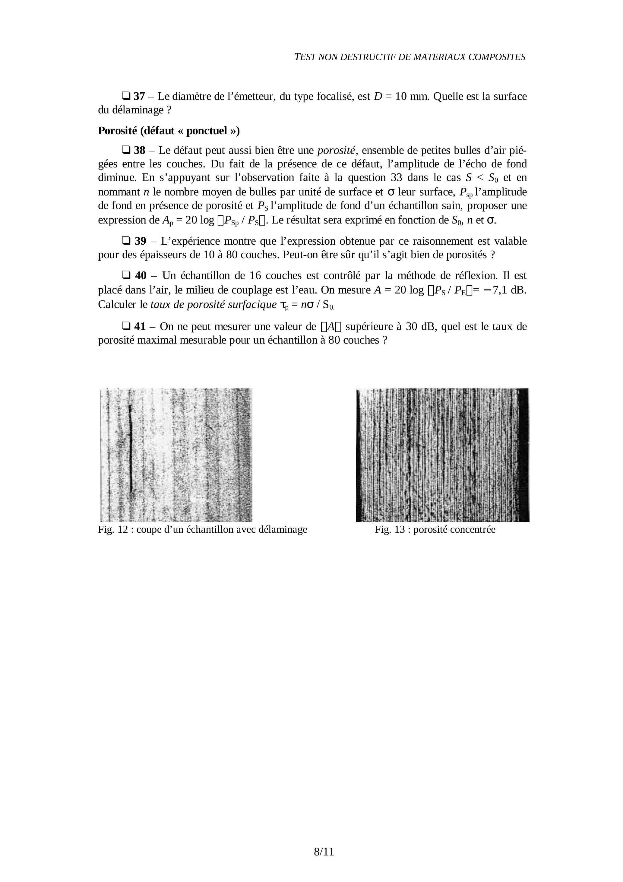 39 - L'expérience montre que l'expression obtenue par ce raisonnement est valable pour des épaisseurs de 10 à 80 couches. Peut-on être sûr qu'il s'agit bien de porosités ? - Un échantillon de 16 couches est contrôlé par la méthode de réflexion. Il est placé dans l'air, le milieu de couplage est l'eau. On mesure . Calculer le taux de porosité surfacique . - On ne peut mesurer une valeur de supérieure à 30 dB , quel est le taux de porosité maximal mesurable pour un échantillon à 80 couches ?