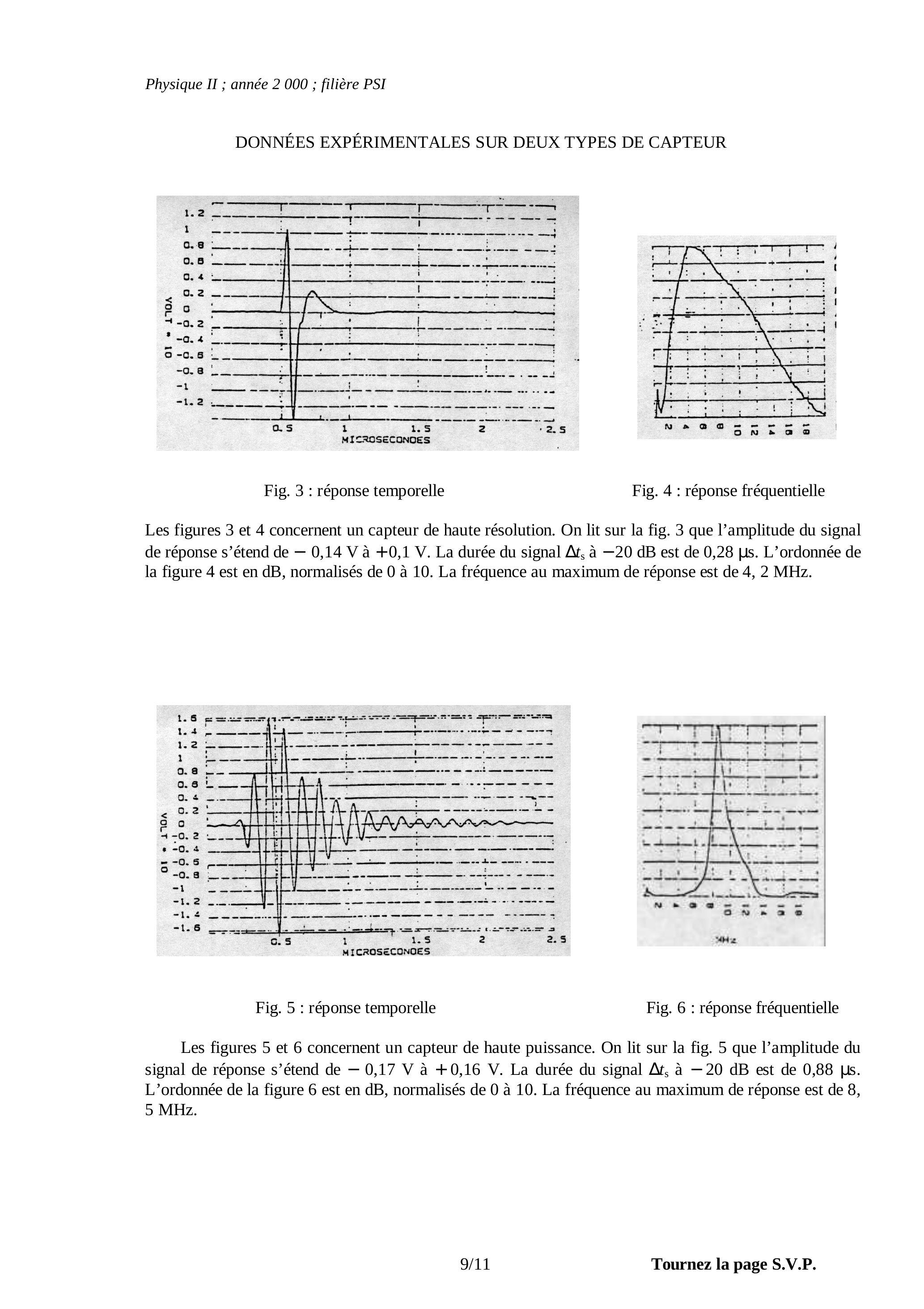Les figures 5 et 6 concernent un capteur de haute puissance. On lit sur la fig. 5 que l'amplitude du signal de réponse s'étend de à . La durée du signal à -20 dB est de . L'ordonnée de la figure 6 est en dB , normalisés de 0 à 10 . La fréquence au maximum de réponse est de 8 , 5 MHz .