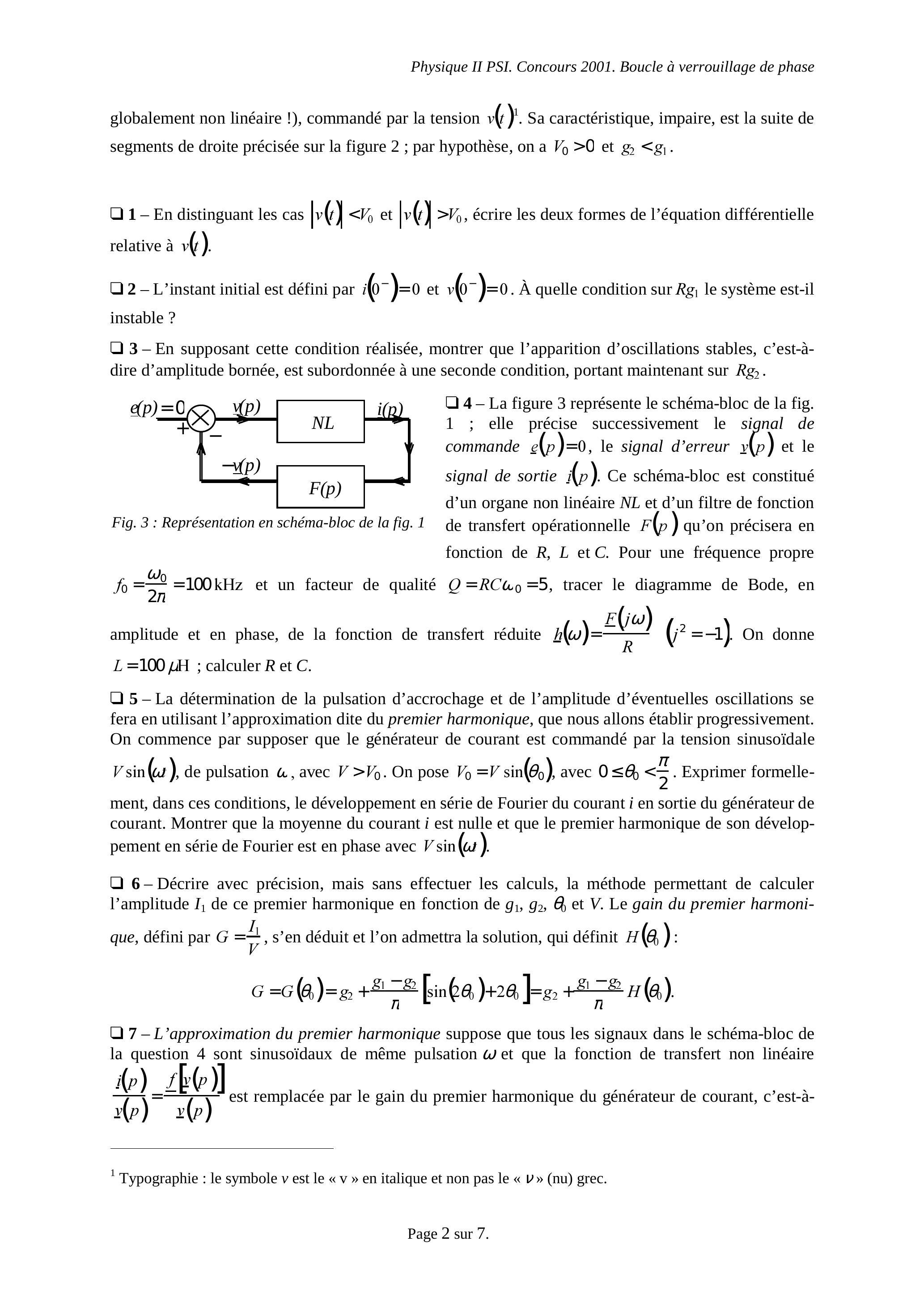 globalement non linéaire !), commandé par la tension . Sa caractéristique, impaire, est la suite de segments de droite précisée sur la figure 2 ; par hypothèse, on a et . - En distinguant les cas et , écrire les deux formes de l'équation différentielle relative à . - L'instant initial est défini par et . À quelle condition sur le système est-il instable? - En supposant cette condition réalisée, montrer que l'apparition d'oscillations stables, c'est-àdire d'amplitude bornée, est subordonnée à une seconde condition, portant maintenant sur .