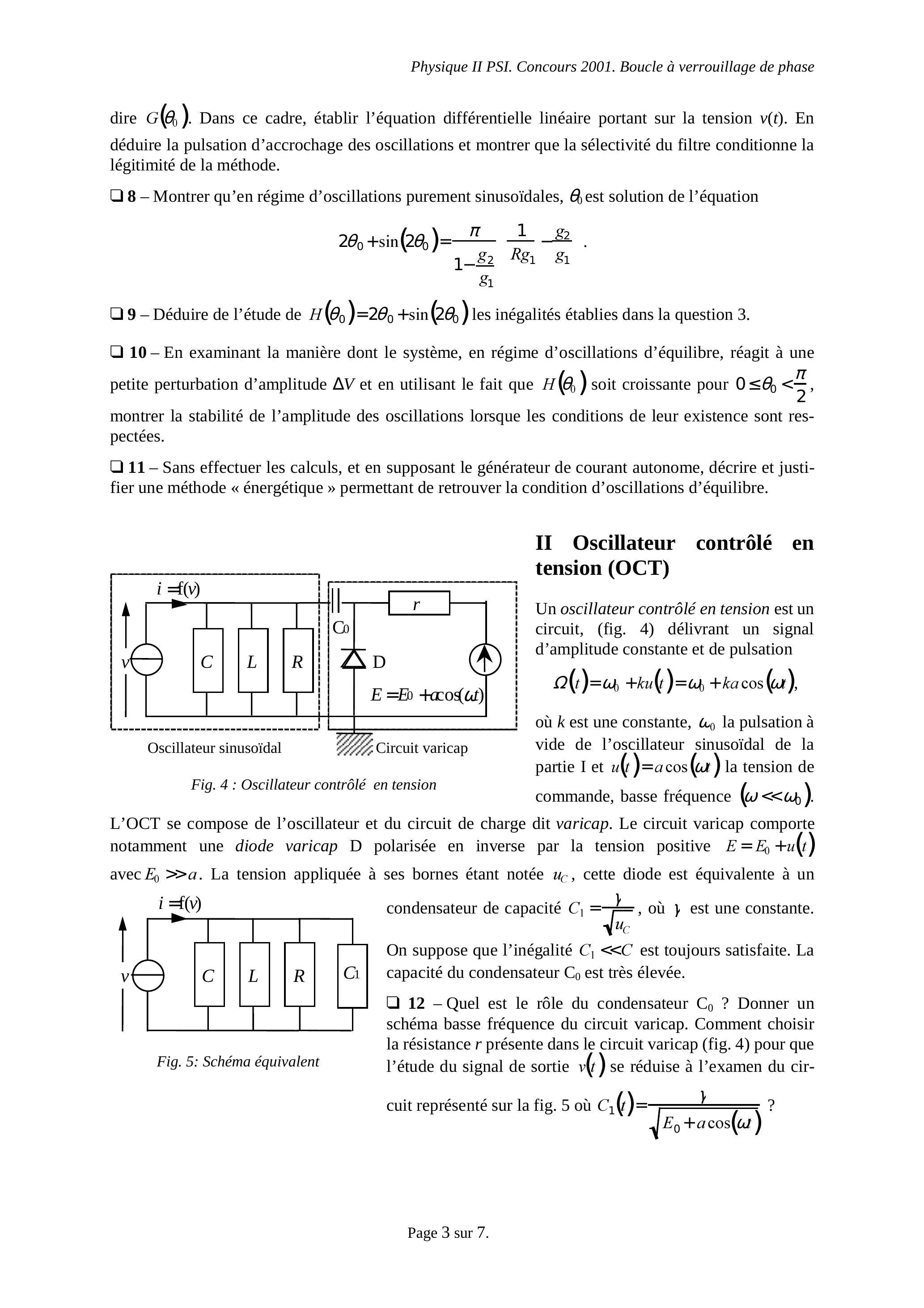 - Tant que , le générateur d'entrée est débranché, la tension délivrée par le multiplieur est nulle, le signal de sortie de l'OCT oscille à la pulsation . À l'instant initial, on branche le générateur délivrant le signal . On constate que la boucle se verrouille sur une bande de fréquences d'entrée appartenant à un intervalle autour de appelé plage de capture, et contenue dans la plage de verrouillage. La condition de capture peut se trouver à l'aide de l'argument qualitatif suivant : un écart initial de pulsation commence par entraîner l'apparition d'une tension . Cette tension modifie à son tour la pulsation du signal de sortie. La boucle est verrouillée lorsque le signal filtré compense l'écart initial de fréquence par rapport à . Montrer que l'amplitude de la plage de capture vérifie . En utilisant les valeurs numériques de la question 20, évaluer l'amplitude de la plage de capture. - On se place désormais en régime quasi-linéaire avec une entrée de fréquence très proche de . On pose et . Déterminer la fonction de transfert du second ordre en donnant sa pulsation propre et son facteur de qualité.