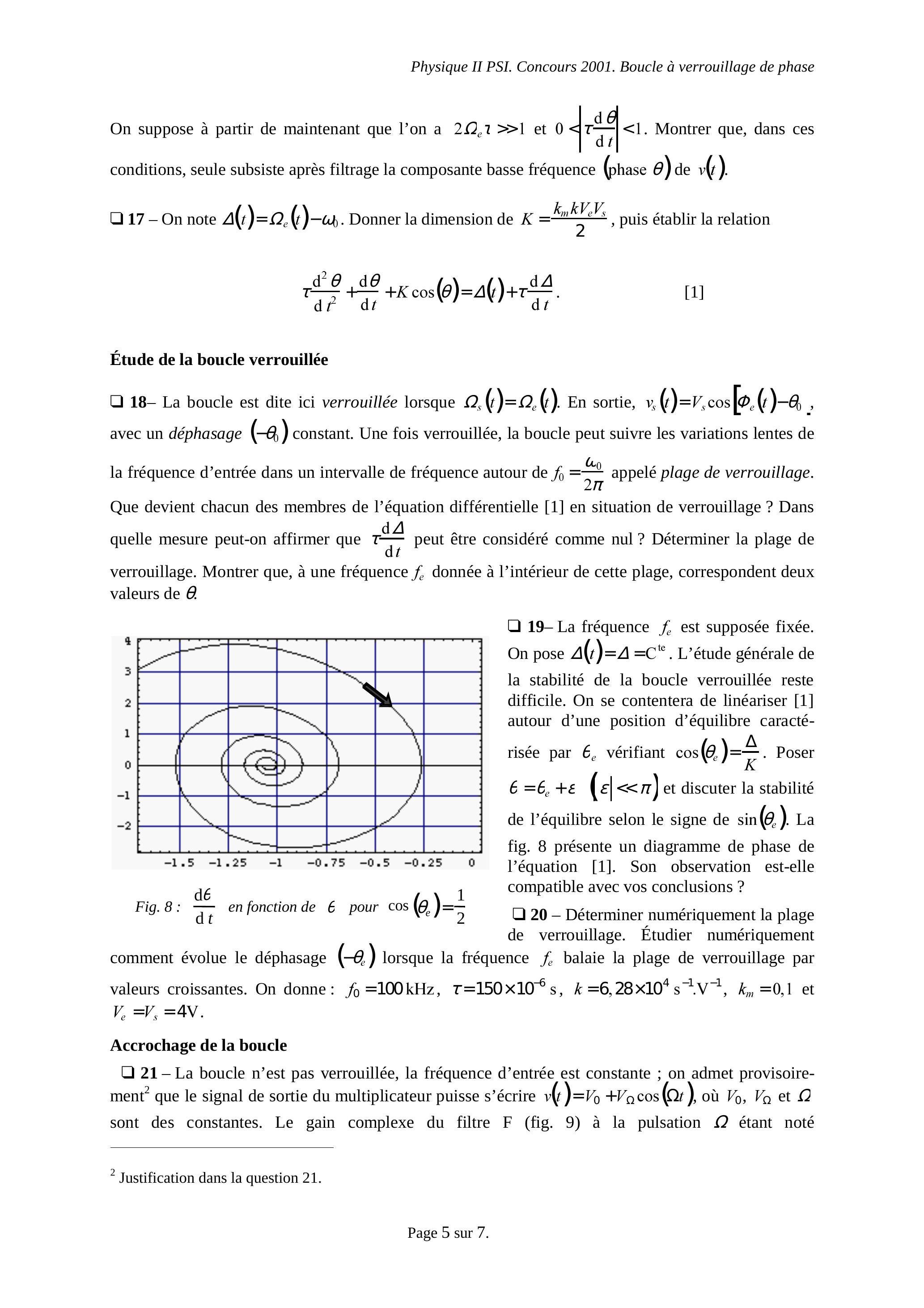 On pose . L'étude générale de la stabilité de la boucle verrouillée reste difficile. On se contentera de linéariser [1] autour d'une position d'équilibre caractérisée par vérifiant . Poser et discuter la stabilité de l'équilibre selon le signe de . La fig. 8 présente un diagramme de phase de l'équation [1]. Son observation est-elle compatible avec vos conclusions? - Déterminer numériquement la plage de verrouillage. Étudier numériquement comment évolue le déphasage ( ) lorsque la fréquence balaie la plage de verrouillage par valeurs croissantes. On donne: et .
