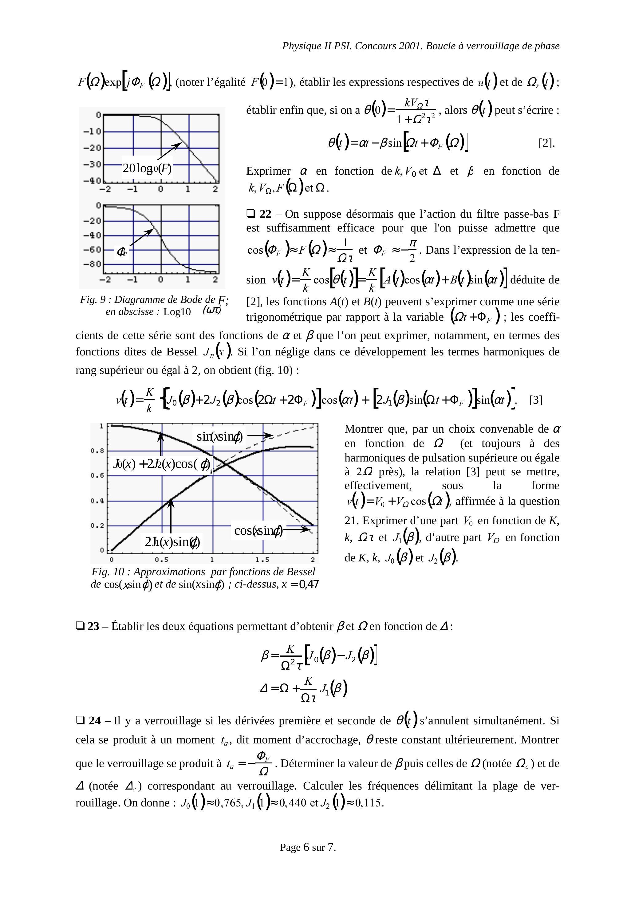 Exprimer en fonction de et et en fonction de et . - On suppose désormais que l'action du filtre passe-bas F est suffisamment efficace pour que l'on puisse admettre que et . Dans l'expression de la tension déduite de [2], les fonctions et peuvent s'exprimer comme une série trigonométrique par rapport à la variable ( ); les coefficients de cette série sont des fonctions de et que l'on peut exprimer, notamment, en termes des fonctions dites de Bessel . Si l'on néglige dans ce développement les termes harmoniques de rang supérieur ou égal à 2 , on obtient (fig. 10) :