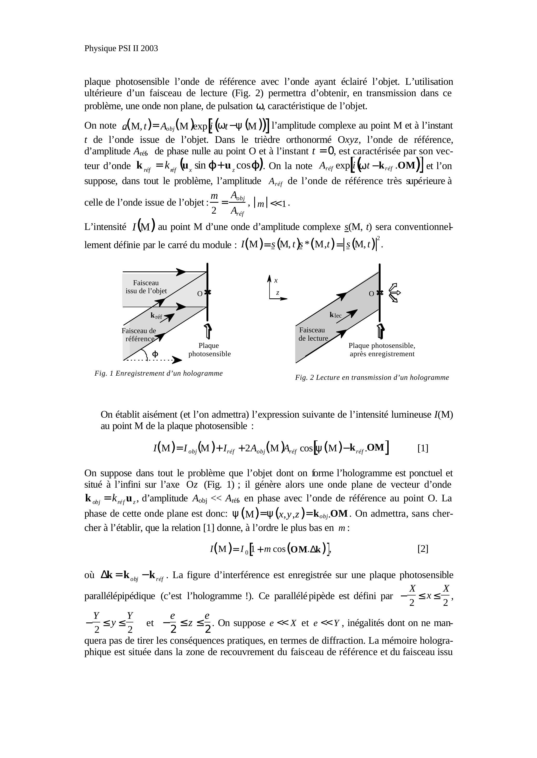 Cette partie, indépendante de la précédente, étudie une méthode d'enregistrement d'un hologramme. On se limite à des phénomènes unidimensionnels selon l'axe . L'intensité lumineuse éclairant le milieu lors de l'enregistrement s'exprime par , avec . L'information sur l'objet holographié est contenue dans le terme de modulation spatiale .