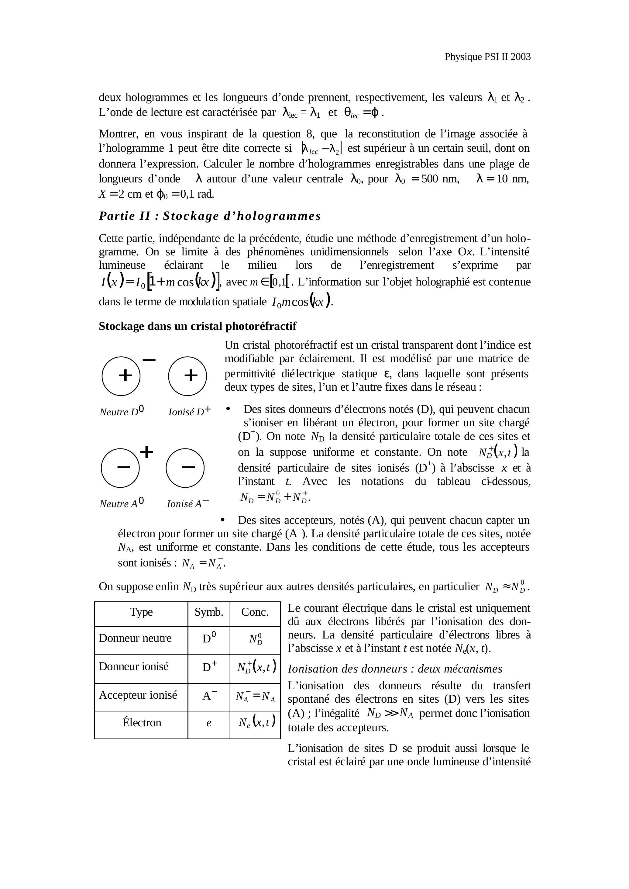 Les deux parties de ce problème sont indépendantes entre elles ; la partie I concerne la production et la restitution d'un certain type d'hologrammes, dits épais, la partie II s'intéresse à une méthode d'enregistrement d'hologramme s'appuyant sur l'effet photoréfractif, caractérisé plus bas.