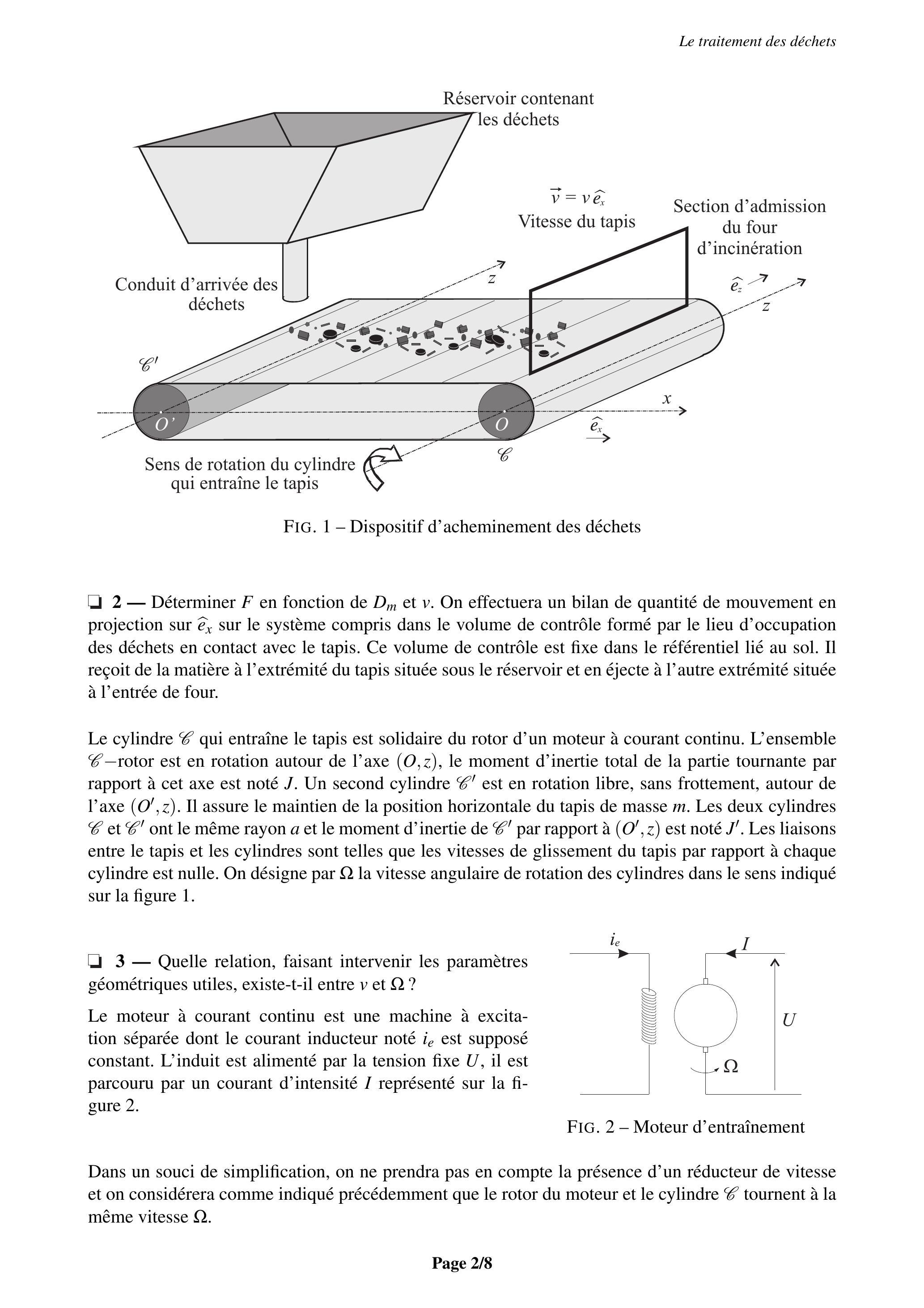 - Déterminer en fonction de et . On effectuera un bilan de quantité de mouvement en projection sur sur le système compris dans le volume de contrôle formé par le lieu d'occupation des déchets en contact avec le tapis. Ce volume de contrôle est fixe dans le référentiel lié au sol. Il reçoit de la matière à l'extrémité du tapis située sous le réservoir et en éjecte à l'autre extrémité située à l'entrée de four.