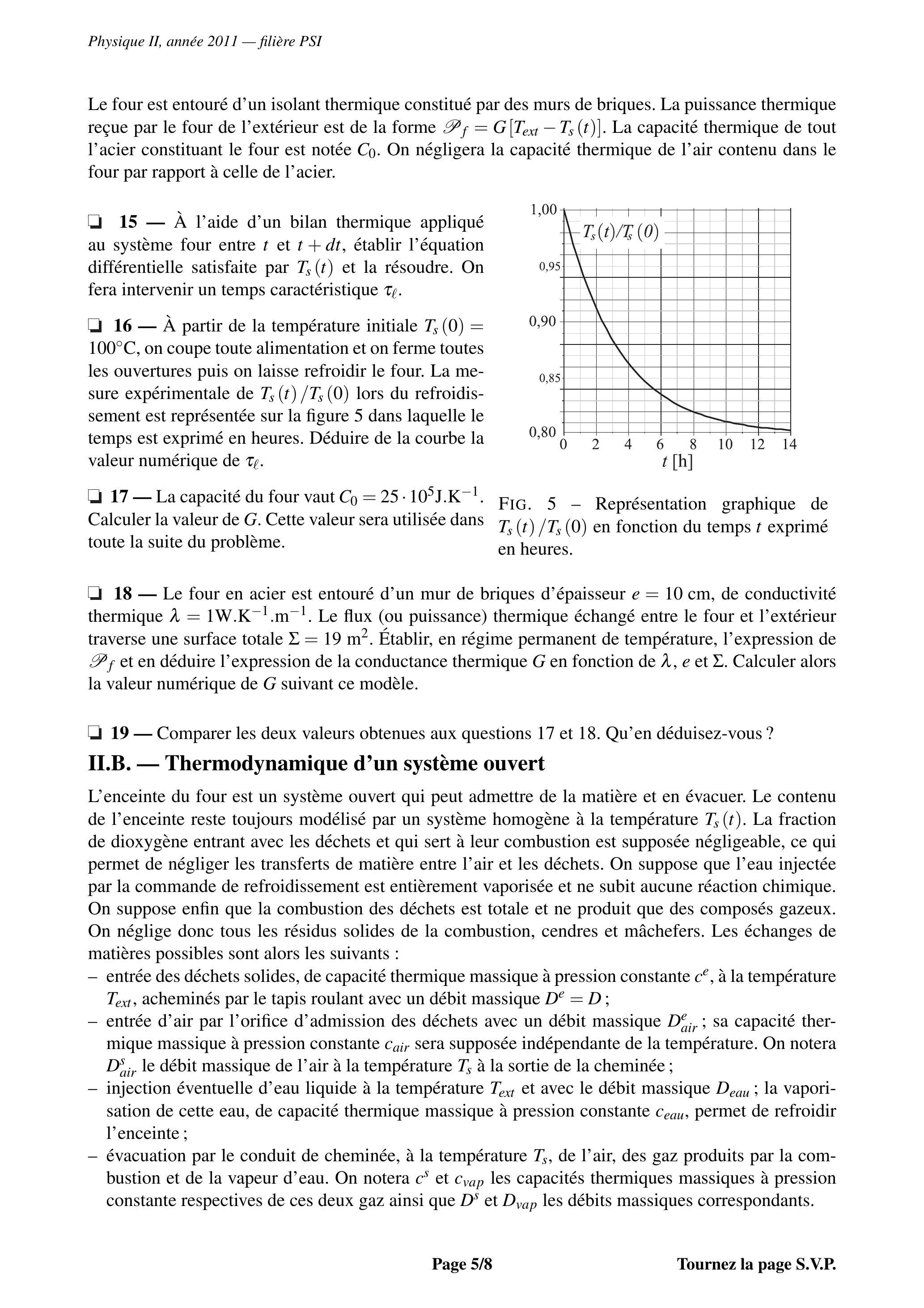15 - À l'aide d'un bilan thermique appliqué au système four entre et , établir l'équation différentielle satisfaite par et la résoudre. On fera intervenir un temps caractéristique . - À partir de la température initiale , on coupe toute alimentation et on ferme toutes les ouvertures puis on laisse refroidir le four. La mesure expérimentale de lors du refroidissement est représentée sur la figure 5 dans laquelle le temps est exprimé en heures. Déduire de la courbe la valeur numérique de . — La capacité du four vaut . Calculer la valeur de . Cette valeur sera utilisée dans toute la suite du problème.
