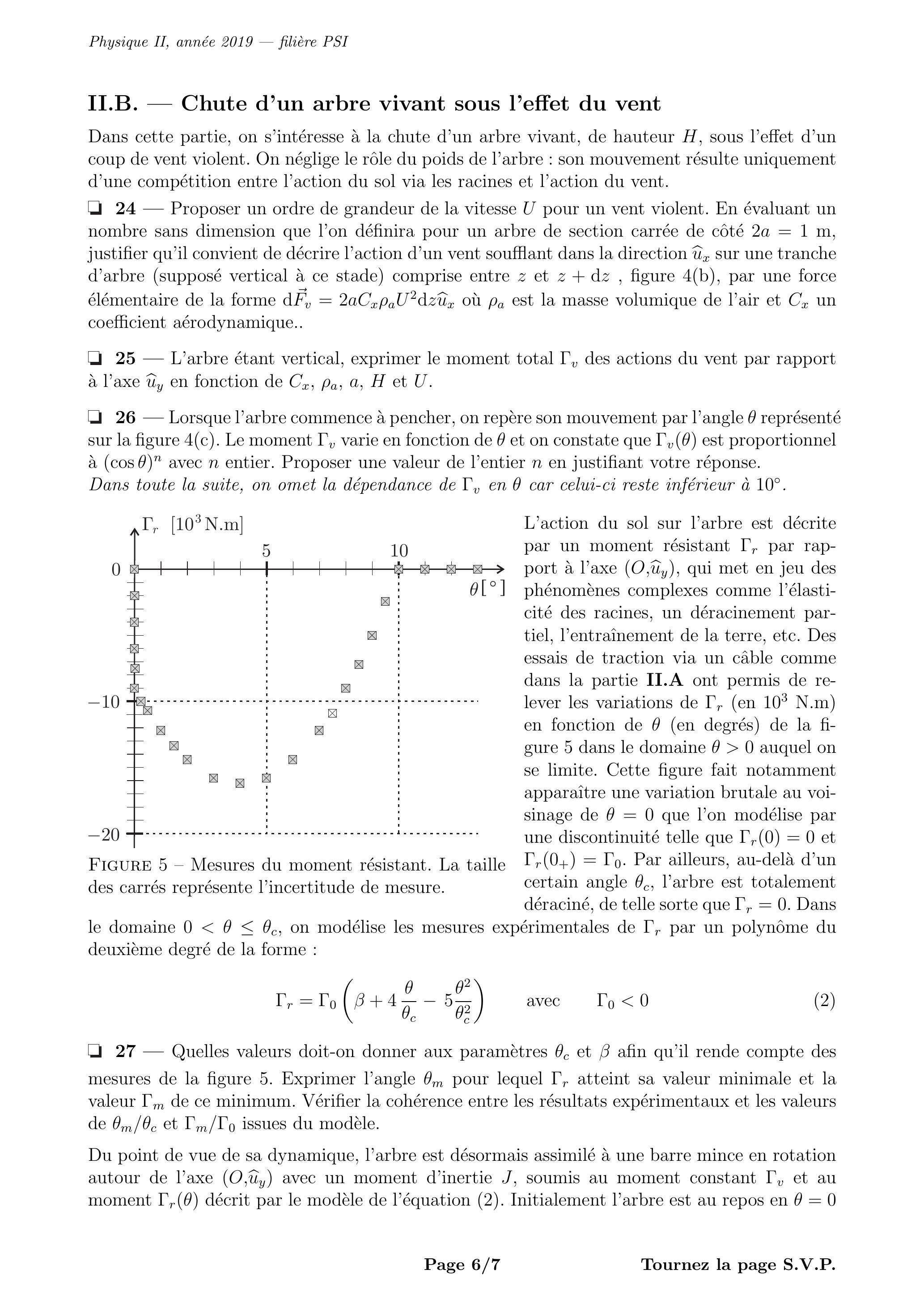 - Montrer que la vitesse angulaire de l'arbre se met sous la forme où est un trinôme du second degré pour la variable réduite que l'on explicitera en fonction de l'unique paramètre . En déduire, en précisant soigneusement le raisonnement adopté, la valeur minimale de permettant au vent de déraciner l'arbre. Calculer la vitesse minimale du vent permettant de déraciner l'arbre correspondant au graphe de la figure 5 sachant que et . On prendra .