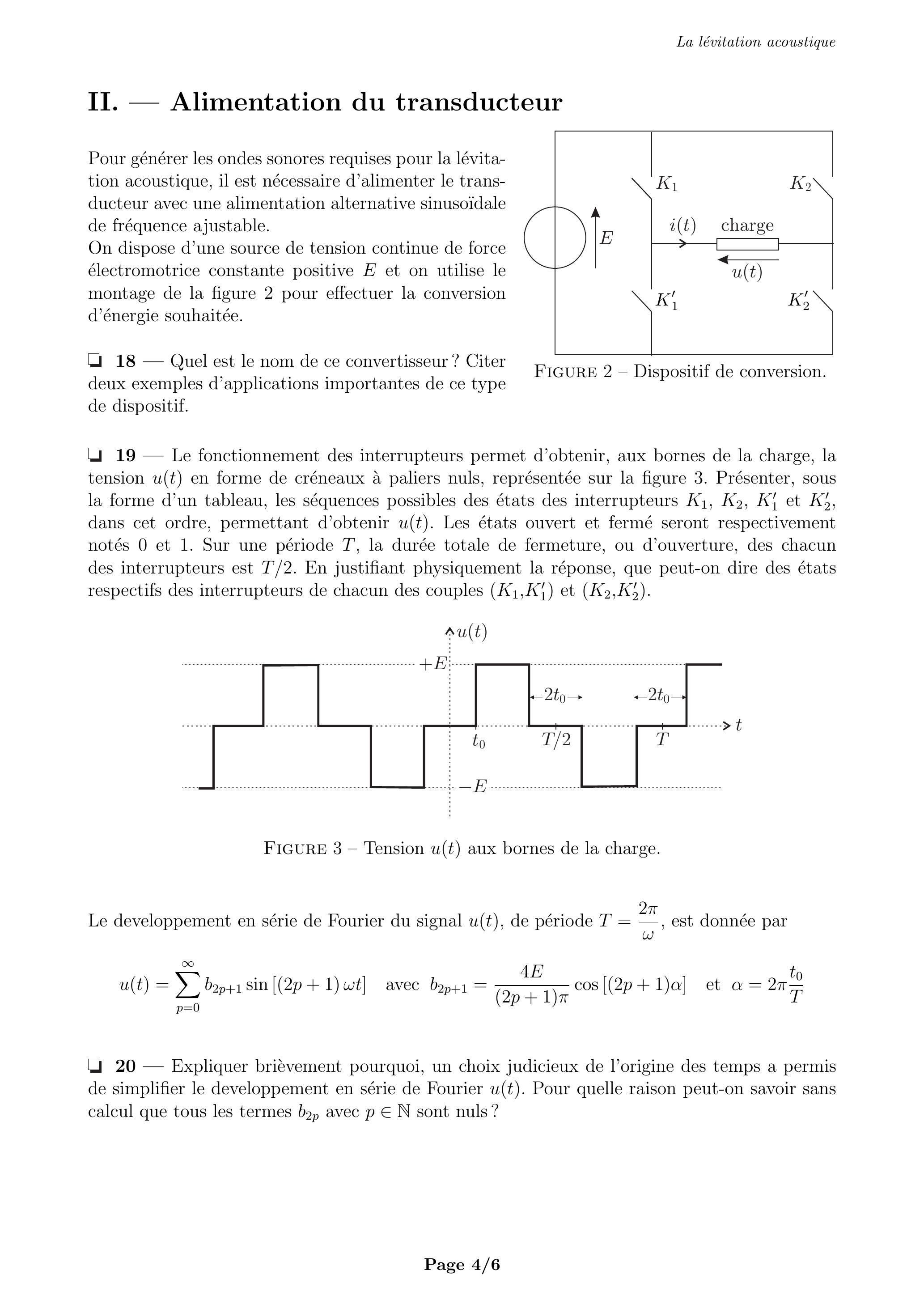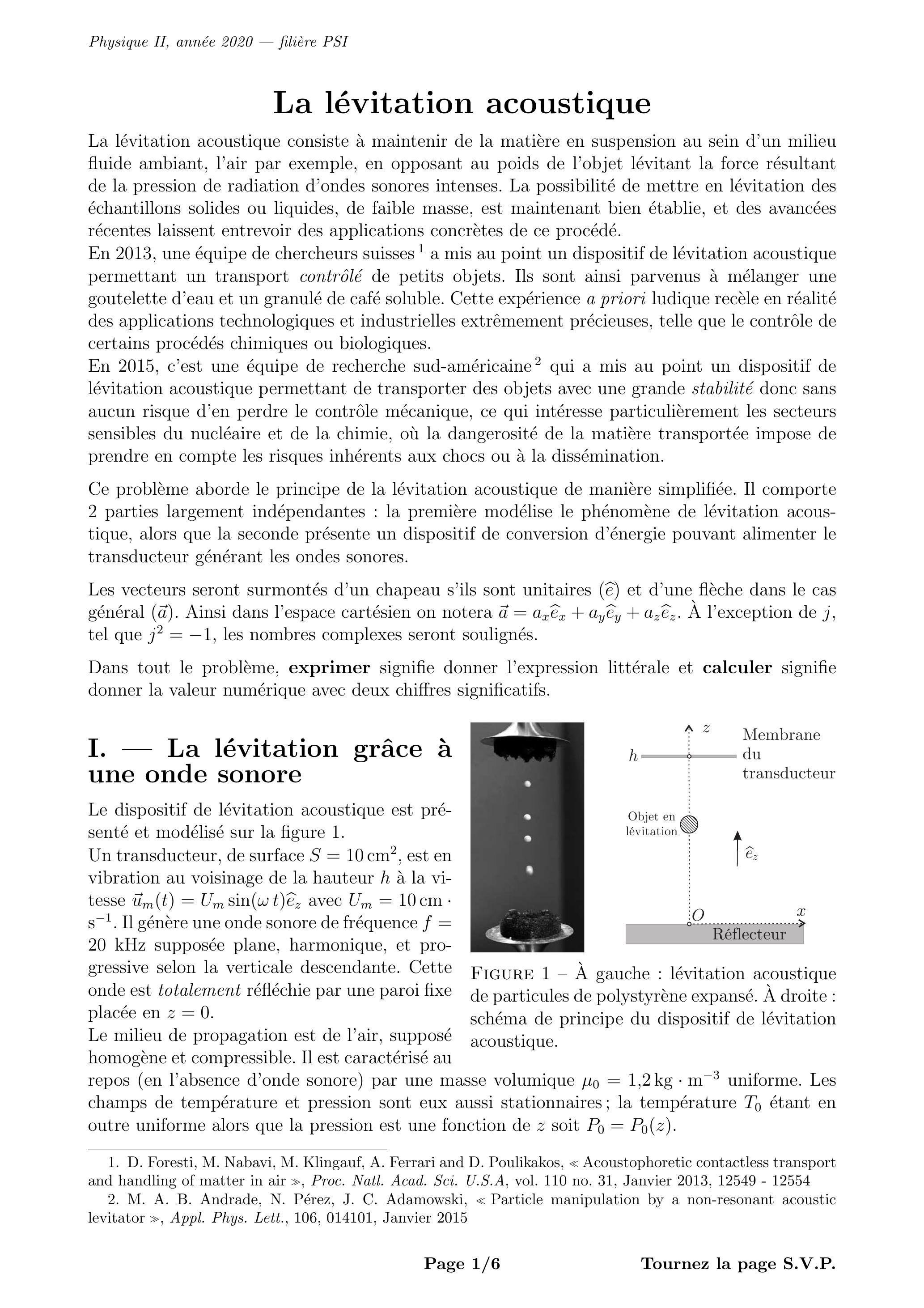Ce problème aborde le principe de la lévitation acoustique de manière simplifiée. Il comporte 2 parties largement indépendantes : la première modélise le phénomène de lévitation acoustique, alors que la seconde présente un dispositif de conversion d'énergie pouvant alimenter le transducteur générant les ondes sonores.