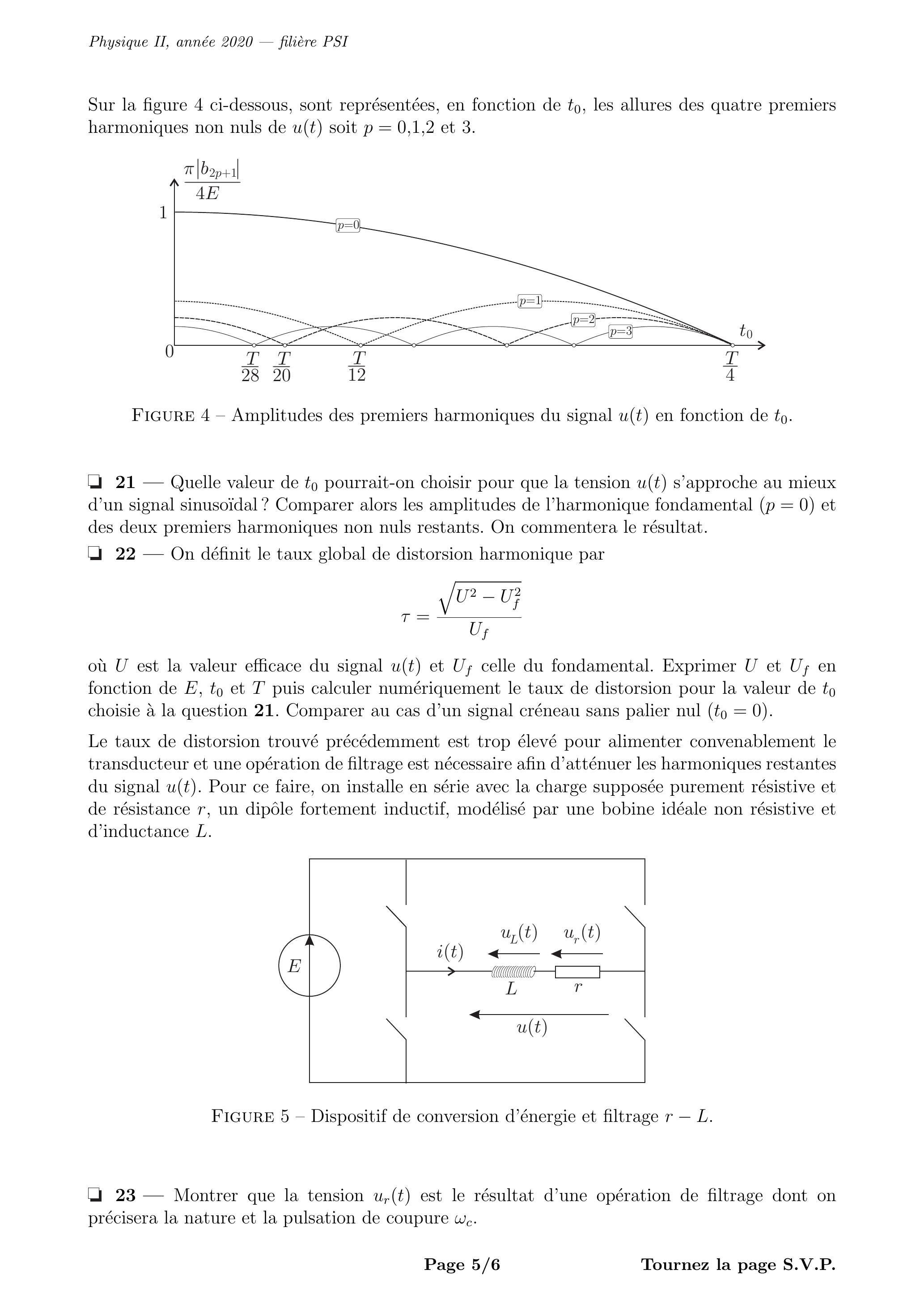 est la valeur efficace du signal et celle du fondamental. Exprimer et en fonction de et puis calculer numériquement le taux de distorsion pour la valeur de choisie à la question 21. Comparer au cas d'un signal créneau sans palier nul ( ).