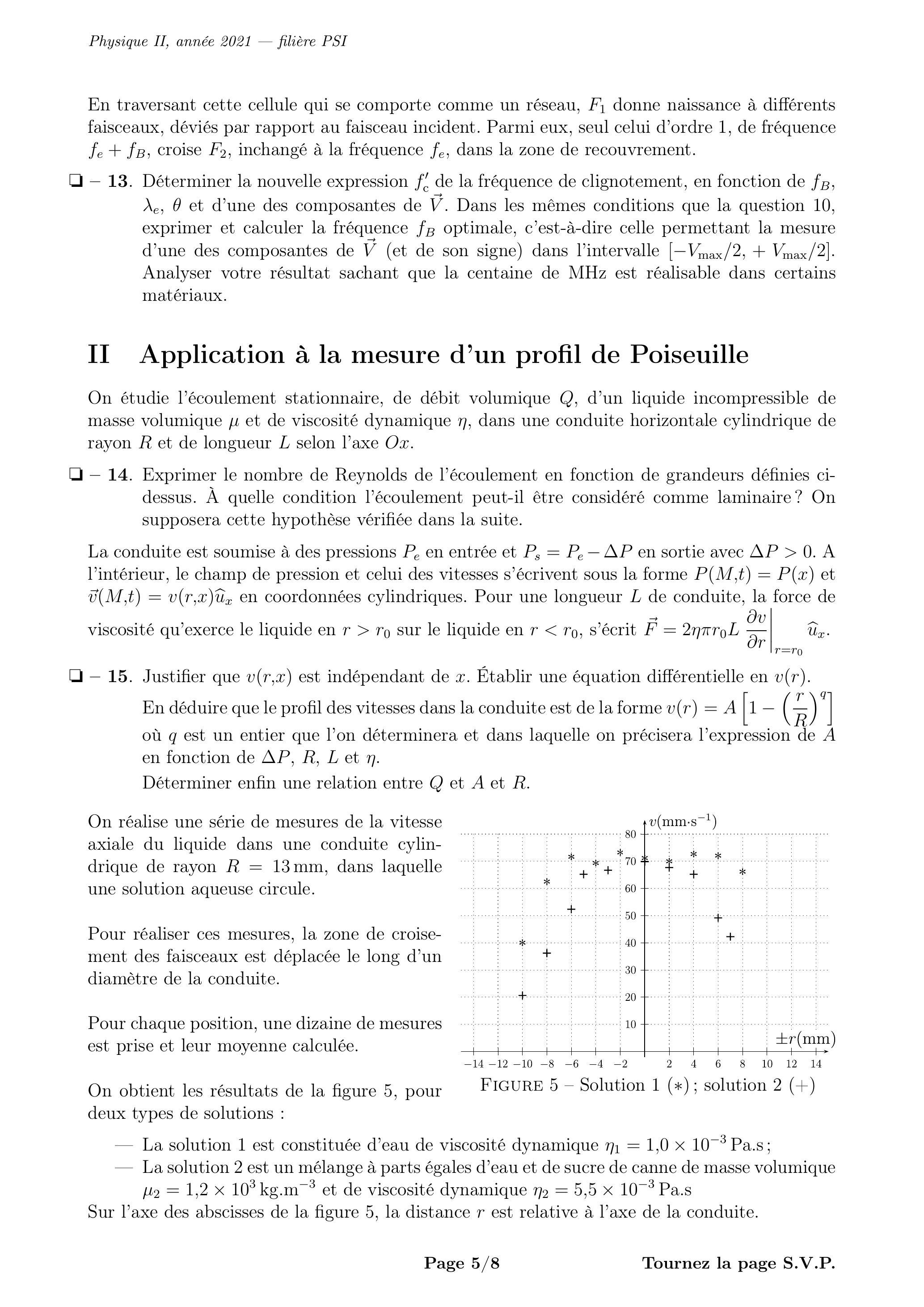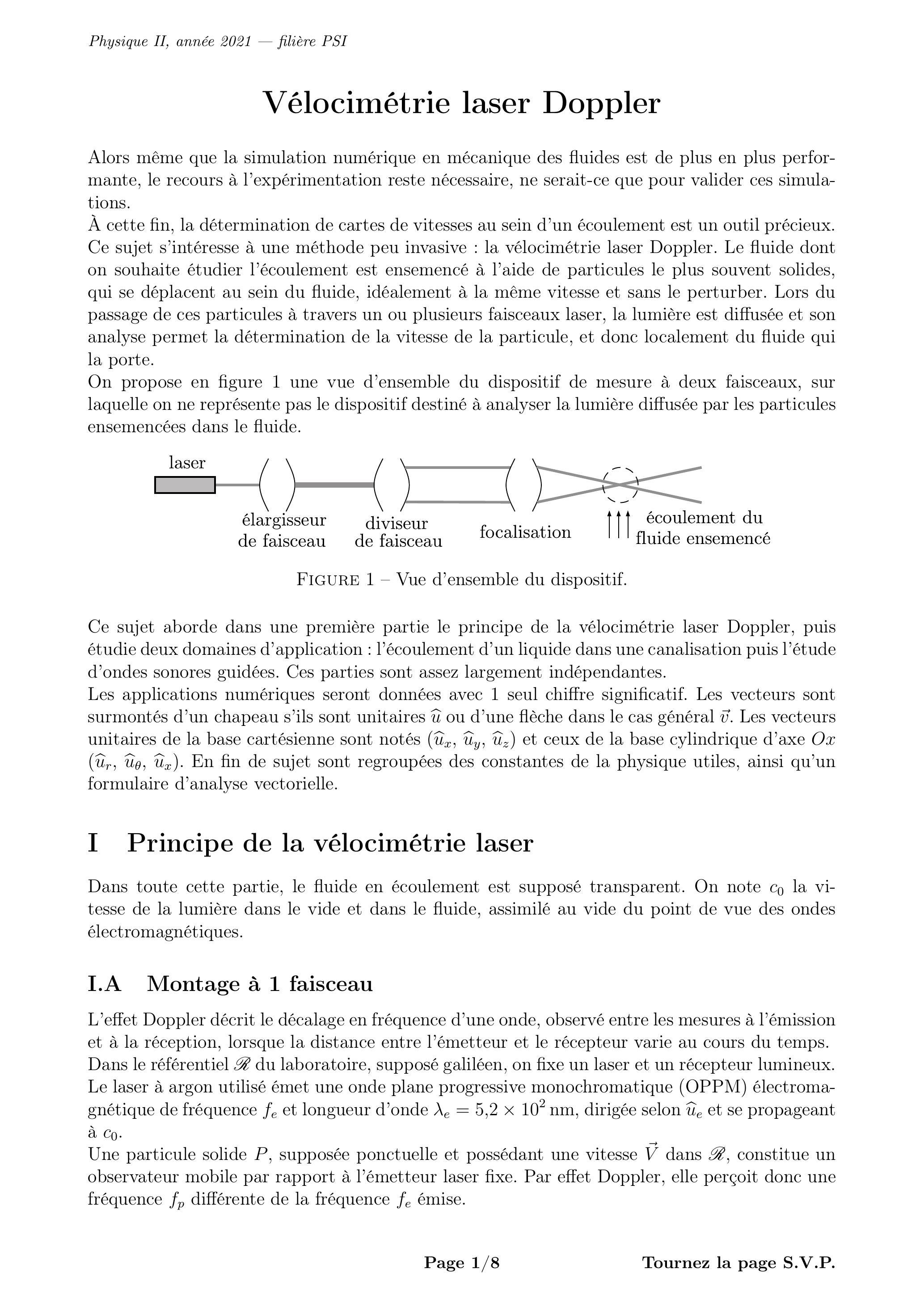 Ce sujet aborde dans une première partie le principe de la vélocimétrie laser Doppler, puis étudie deux domaines d'application : l'écoulement d'un liquide dans une canalisation puis l'étude d'ondes sonores guidées. Ces parties sont assez largement indépendantes.