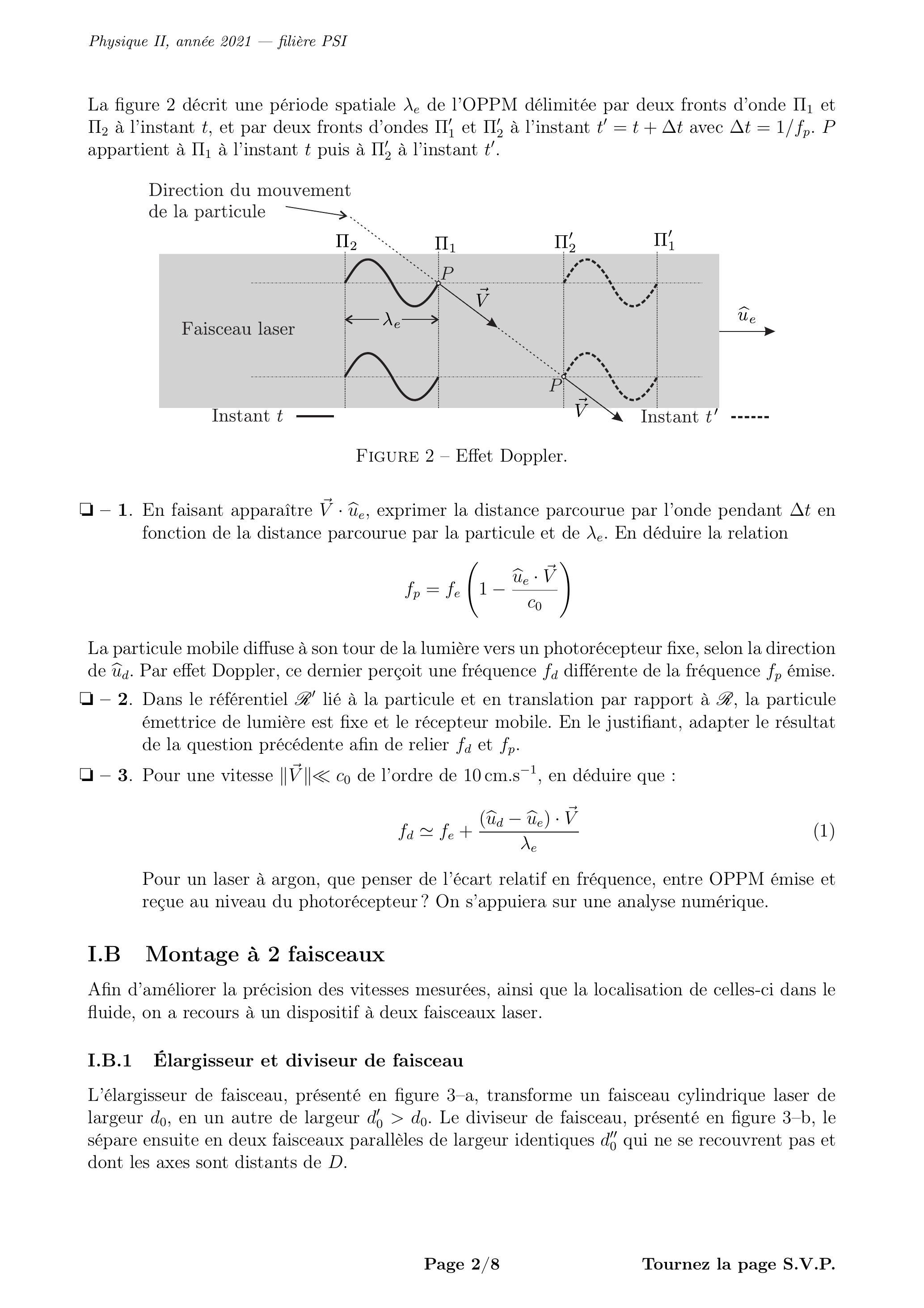 La valeur de la composante de la vitesse particulaire intervenant dans le résultat de la question précédente est de ; calculer numériquement la valeur de obtenue avec deux faisceaux issus d'un laser à argon faisant un angle de entre eux. Justifier l'utilisation de deux faisceaux lasers en termes de précision de la mesure et de localisation de la particule.