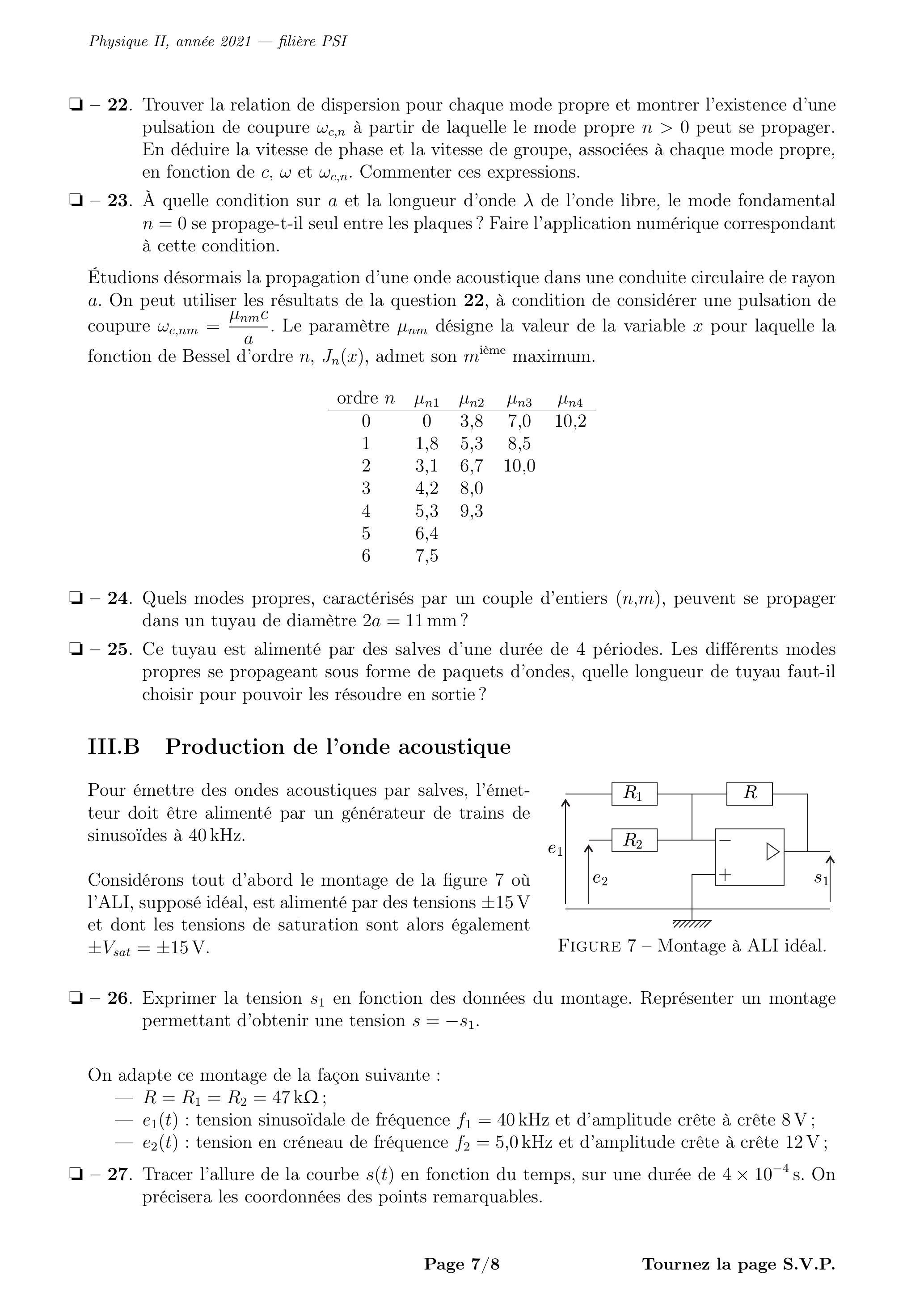 Étudions désormais la propagation d'une onde acoustique dans une conduite circulaire de rayon a. On peut utiliser les résultats de la question 22, à condition de considérer une pulsation de coupure . Le paramètre désigne la valeur de la variable pour laquelle la fonction de Bessel d'ordre , admet son è maximum.
