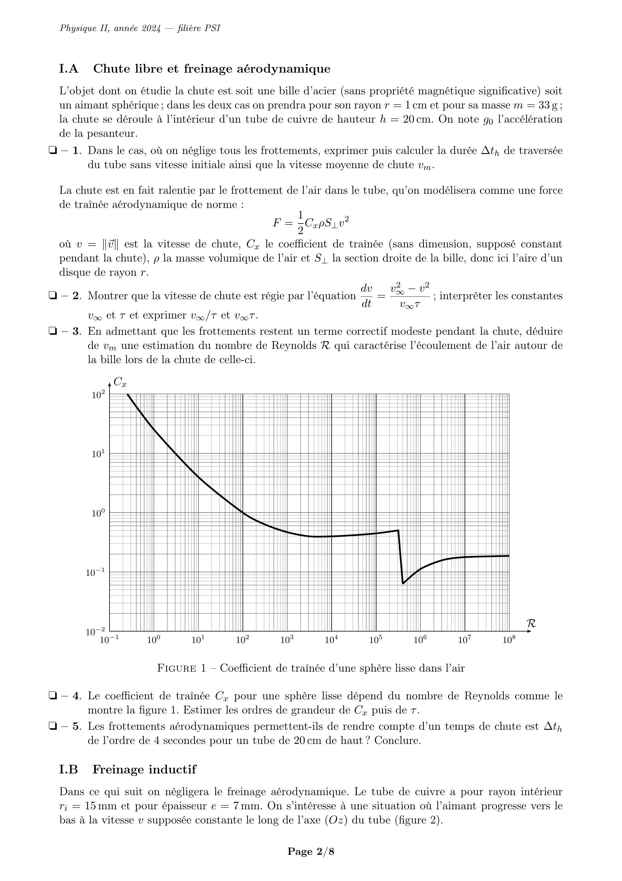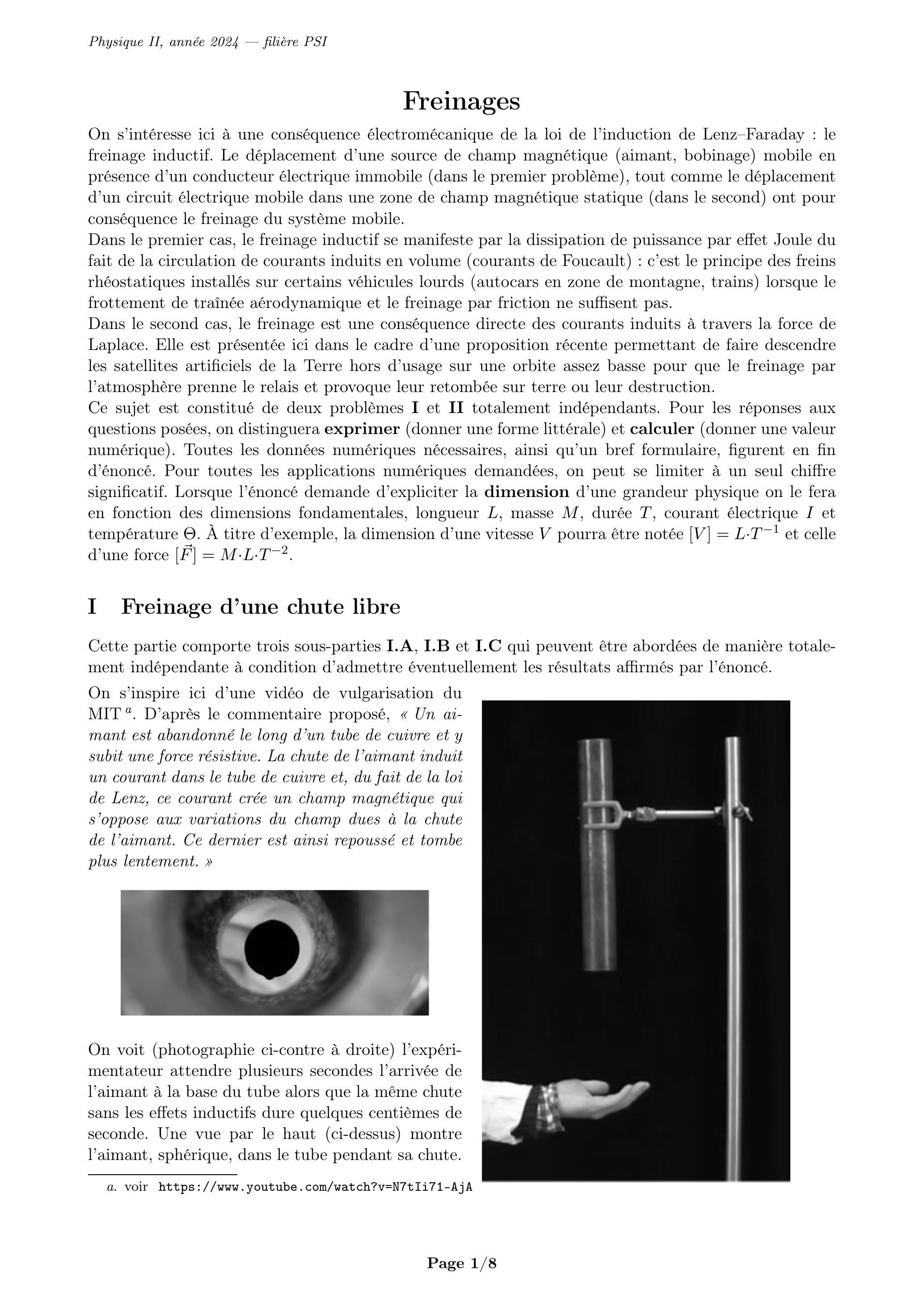 . Tous calculs faits, on obtient où . En admettant la conversion totale de l'énergie mécanique en énergie électrique lors du freinage inductif, donner l'expression littérale de la force de freinage exercée sur l'aimant pendant sa chute, en fonction de et . . Le temps de chute est pour un tube de 20 cm de haut. Quel serait le résultat de la même expérience avec un tube de même longueur en aluminium ? en acier ? . Calculer le moment dipolaire de l'aimant utilisé.