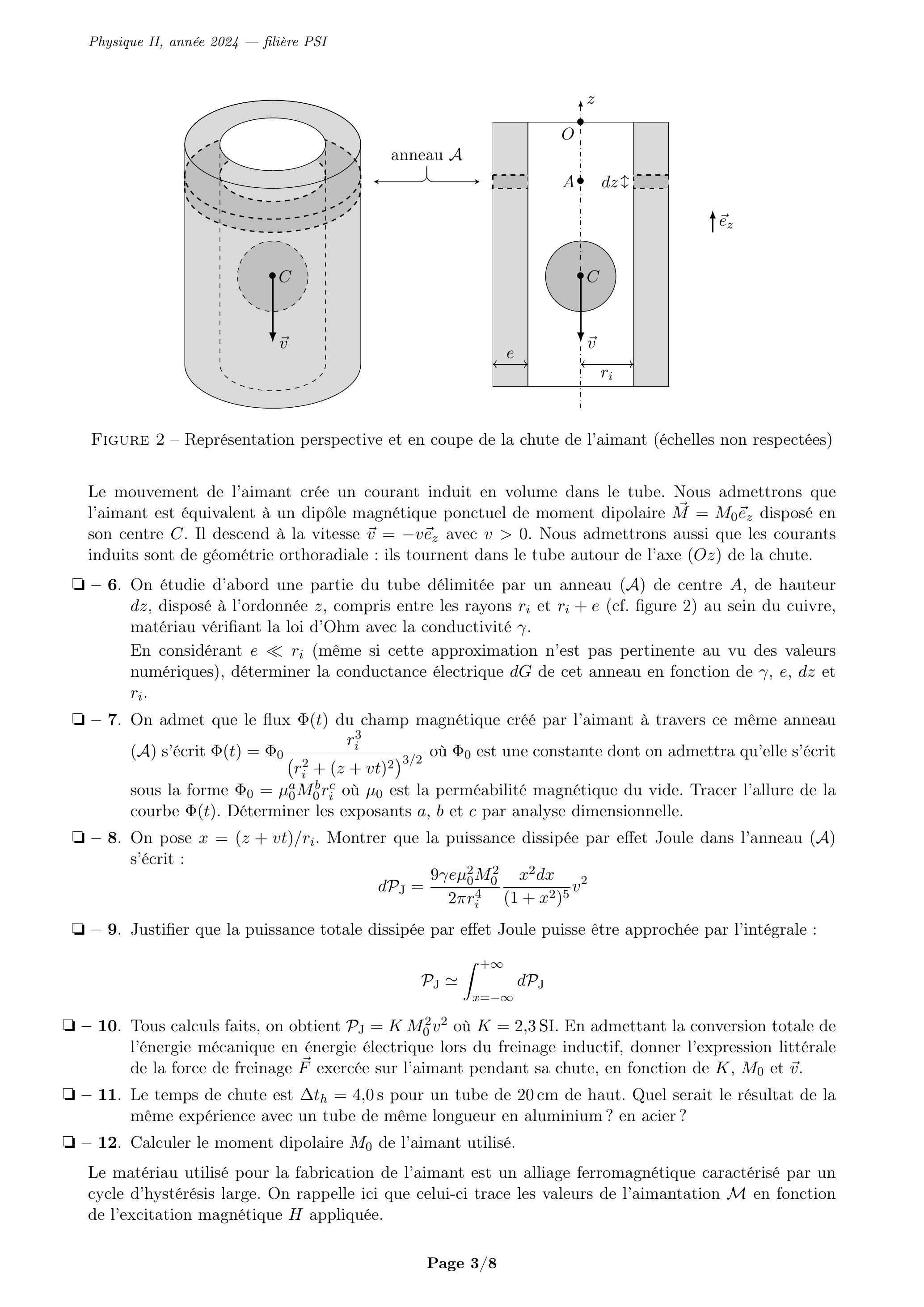 Le mouvement de l'aimant crée un courant induit en volume dans le tube. Nous admettrons que l'aimant est équivalent à un dipôle magnétique ponctuel de moment dipolaire disposé en son centre . Il descend à la vitesse avec . Nous admettrons aussi que les courants induits sont de géométrie orthoradiale : ils tournent dans le tube autour de l'axe ( ) de la chute. . On étudie d'abord une partie du tube délimitée par un anneau ( ) de centre , de hauteur , disposé à l'ordonnée , compris entre les rayons et (cf. figure 2 ) au sein du cuivre, matériau vérifiant la loi d'Ohm avec la conductivité .