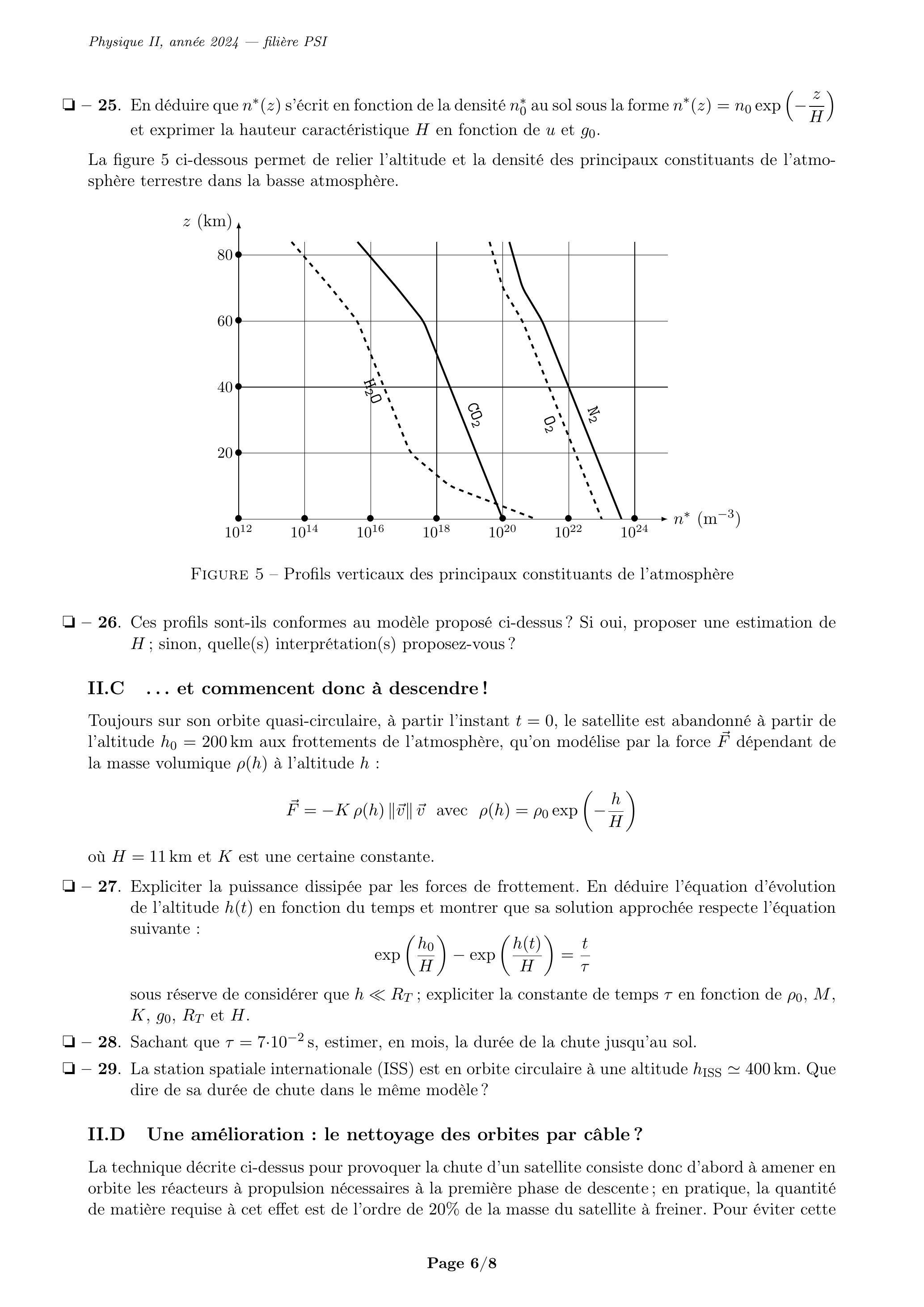Toujours sur son orbite quasi-circulaire, à partir l'instant , le satellite est abandonné à partir de l'altitude aux frottements de l'atmosphère, qu'on modélise par la force dépendant de la masse volumique à l'altitude :