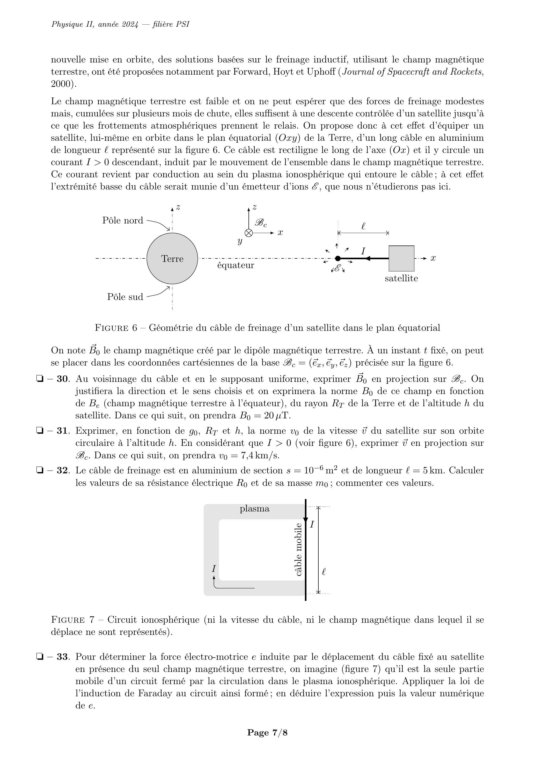 Le champ magnétique terrestre est faible et on ne peut espérer que des forces de freinage modestes mais, cumulées sur plusieurs mois de chute, elles suffisent à une descente contrôlée d'un satellite jusqu'à ce que les frottements atmosphériques prennent le relais. On propose donc à cet effet d'équiper un satellite, lui-même en orbite dans le plan équatorial de la Terre, d'un long câble en aluminium de longueur représenté sur la figure 6 . Ce câble est rectiligne le long de l'axe ( ) et il y circule un courant descendant, induit par le mouvement de l'ensemble dans le champ magnétique terrestre. Ce courant revient par conduction au sein du plasma ionosphérique qui entoure le câble ; à cet effet l'extrémité basse du câble serait munie d'un émetteur d'ions , que nous n'étudierons pas ici.