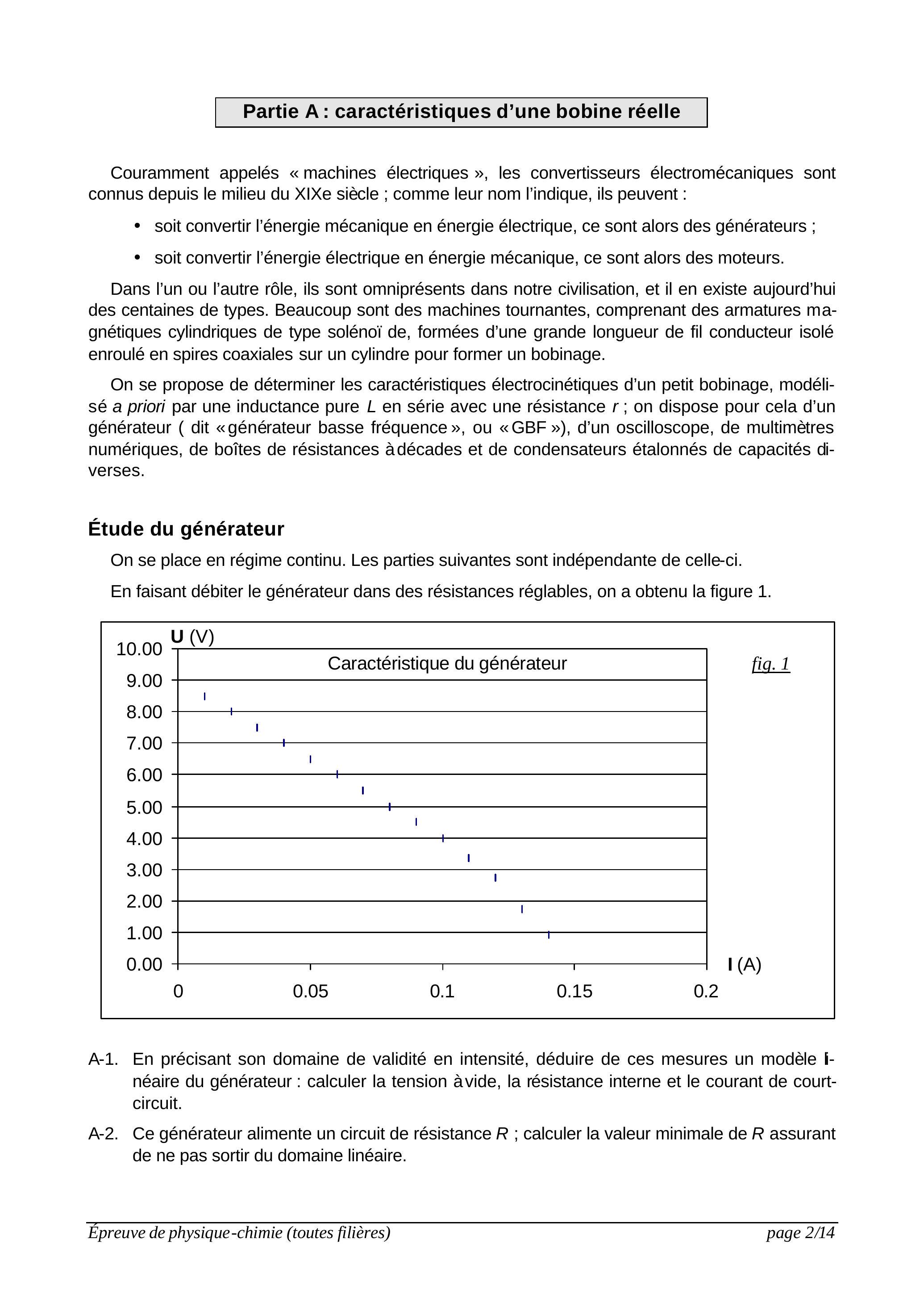 A-1. En précisant son domaine de validité en intensité, déduire de ces mesures un modèle inéaire du générateur : calculer la tension àvide, la résistance interne et le courant de courtcircuit.