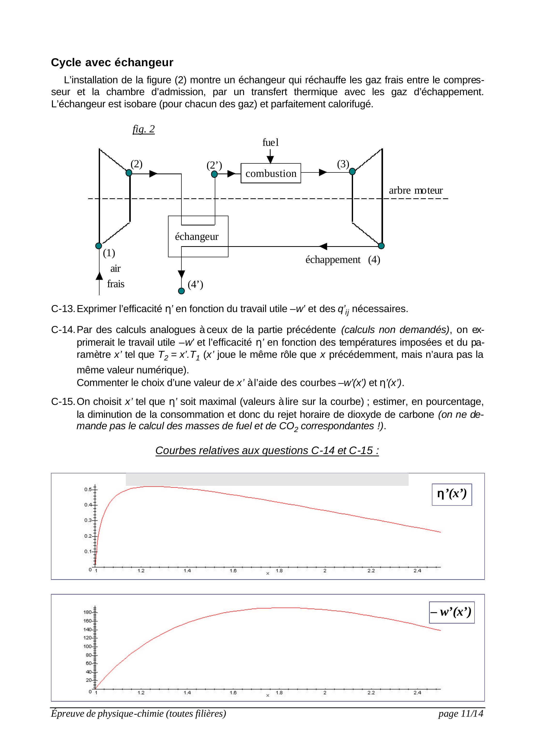 L'installation de la figure (2) montre un échangeur qui réchauffe les gaz frais entre le compresseur et la chambre d'admission, par un transfert thermique avec les gaz d'échappement. L'échangeur est isobare (pour chacun des gaz) et parfaitement calorifugé.