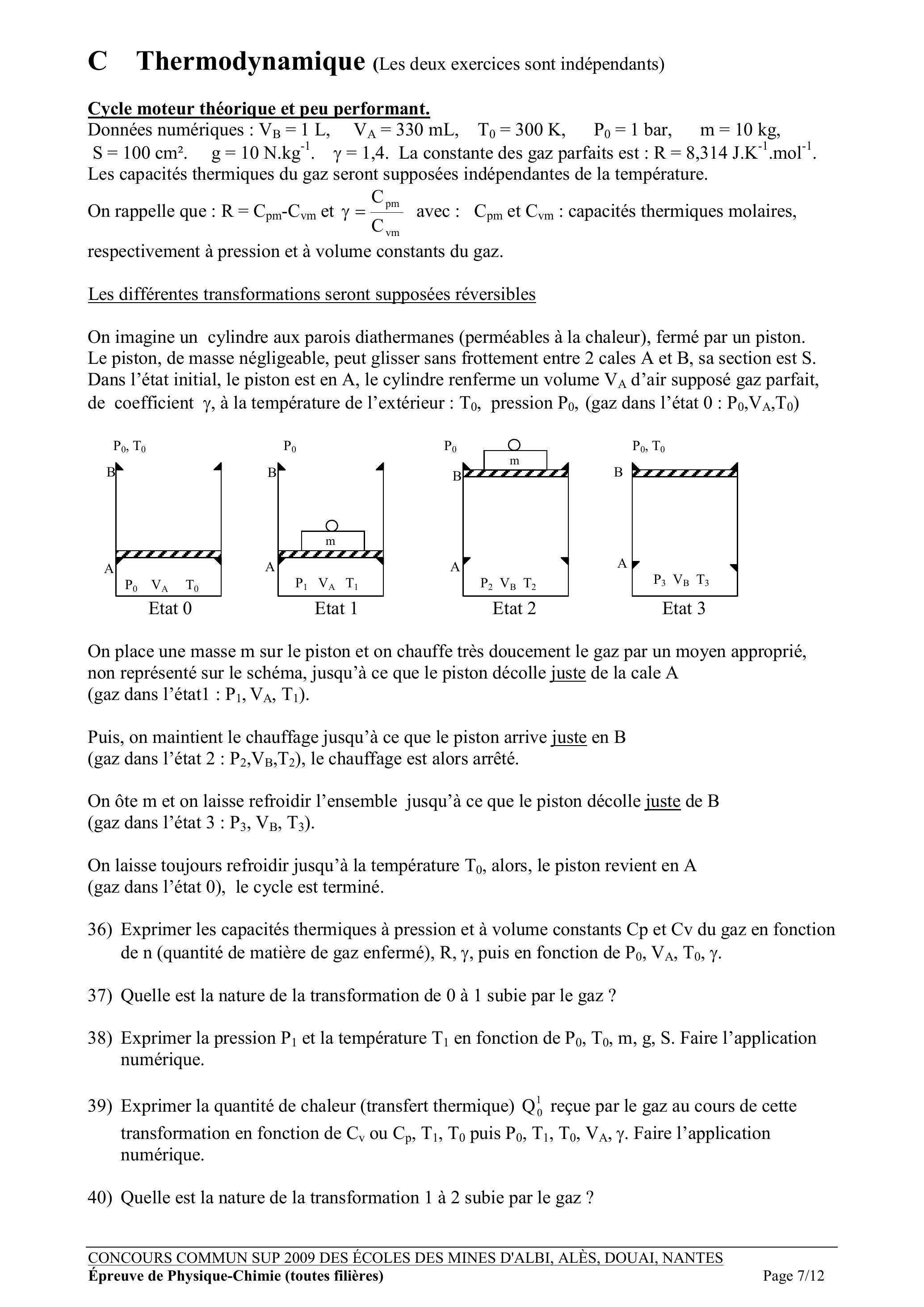 39) Exprimer la quantité de chaleur (transfert thermique) reçue par le gaz au cours de cette transformation en fonction de ou puis . Faire l'application numérique.