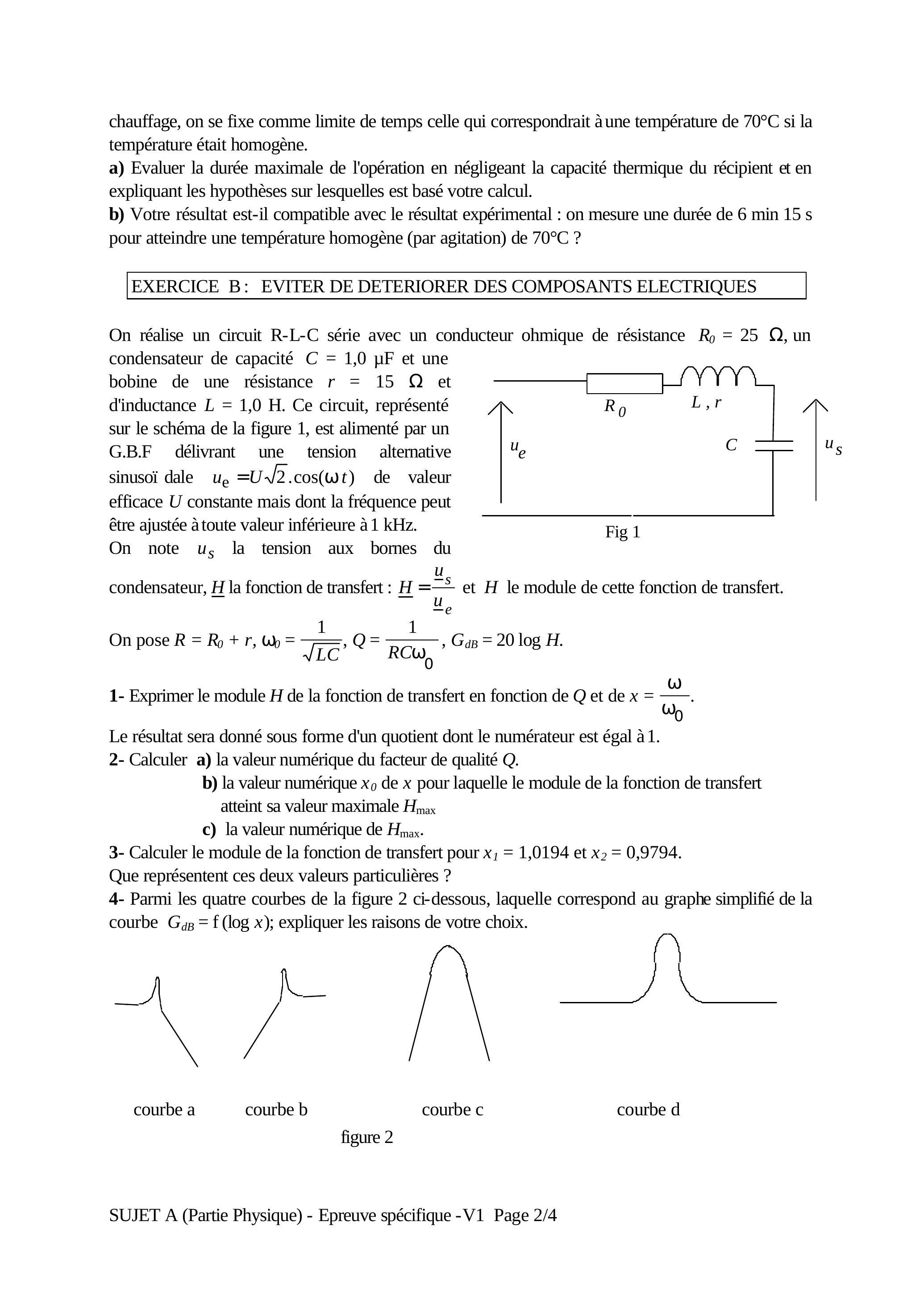 On réalise un circuit R-L-C série avec un conducteur ohmique de résistance , un condensateur de capacité et une bobine de une résistance et d'inductance . Ce circuit, représenté sur le schéma de la figure 1, est alimenté par un G.B.F délivrant une tension alternative sinusoï dale de valeur efficace constante mais dont la fréquence peut être ajustée à toute valeur inférieure à 1 kHz .