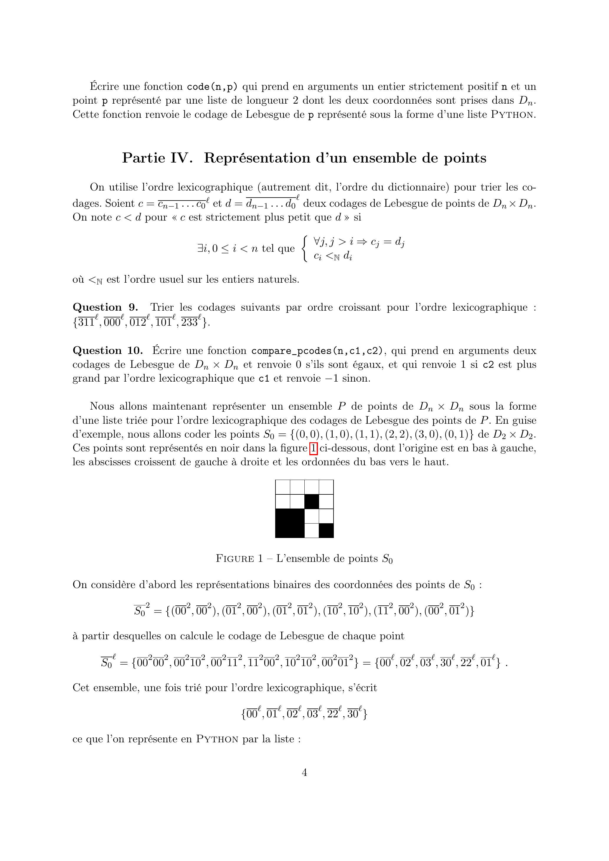 Question 11. On pose pour cette question . Donner la représentation sous forme de codage de Lebesgue compacté trié par ordre lexicographique de l'ensemble de points valant .