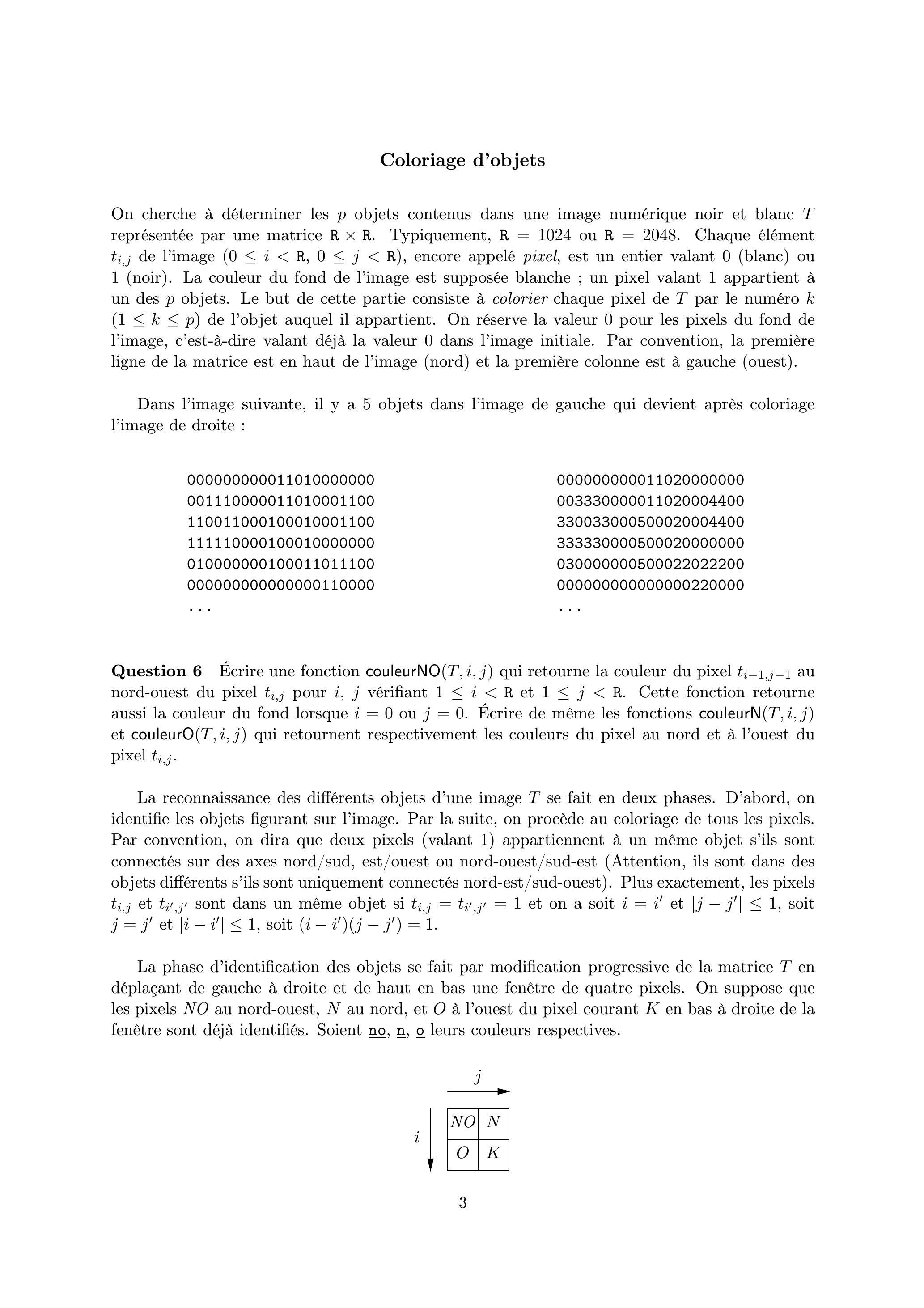 On cherche à déterminer les objets contenus dans une image numérique noir et blanc représentée par une matrice . Typiquement, ou . Chaque élément de l'image ( ), encore appelé pixel, est un entier valant 0 (blanc) ou 1 (noir). La couleur du fond de l'image est supposée blanche ; un pixel valant 1 appartient à un des objets. Le but de cette partie consiste à colorier chaque pixel de par le numéro ( ) de l'objet auquel il appartient. On réserve la valeur 0 pour les pixels du fond de l'image, c'est-à-dire valant déjà la valeur 0 dans l'image initiale. Par convention, la première ligne de la matrice est en haut de l'image (nord) et la première colonne est à gauche (ouest).