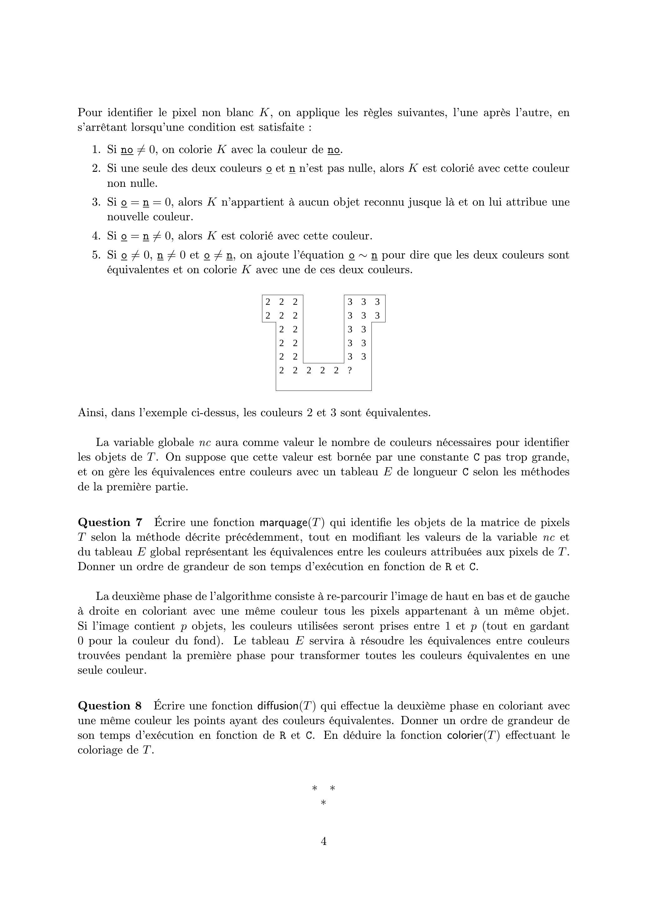 Question 7 Écrire une fonction marquage( ) qui identifie les objets de la matrice de pixels selon la méthode décrite précédemment, tout en modifiant les valeurs de la variable et du tableau global représentant les équivalences entre les couleurs attribuées aux pixels de . Donner un ordre de grandeur de son temps d'exécution en fonction de R et C .