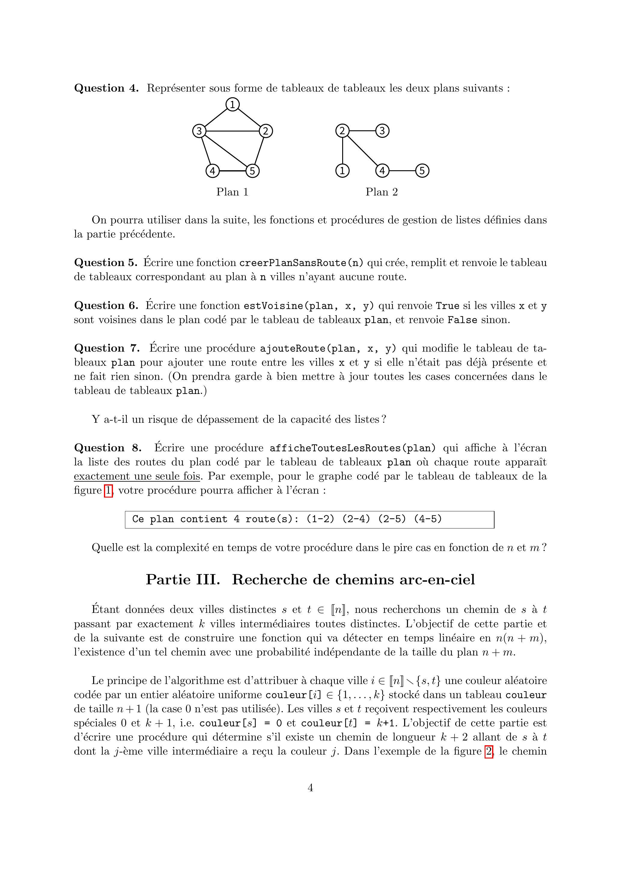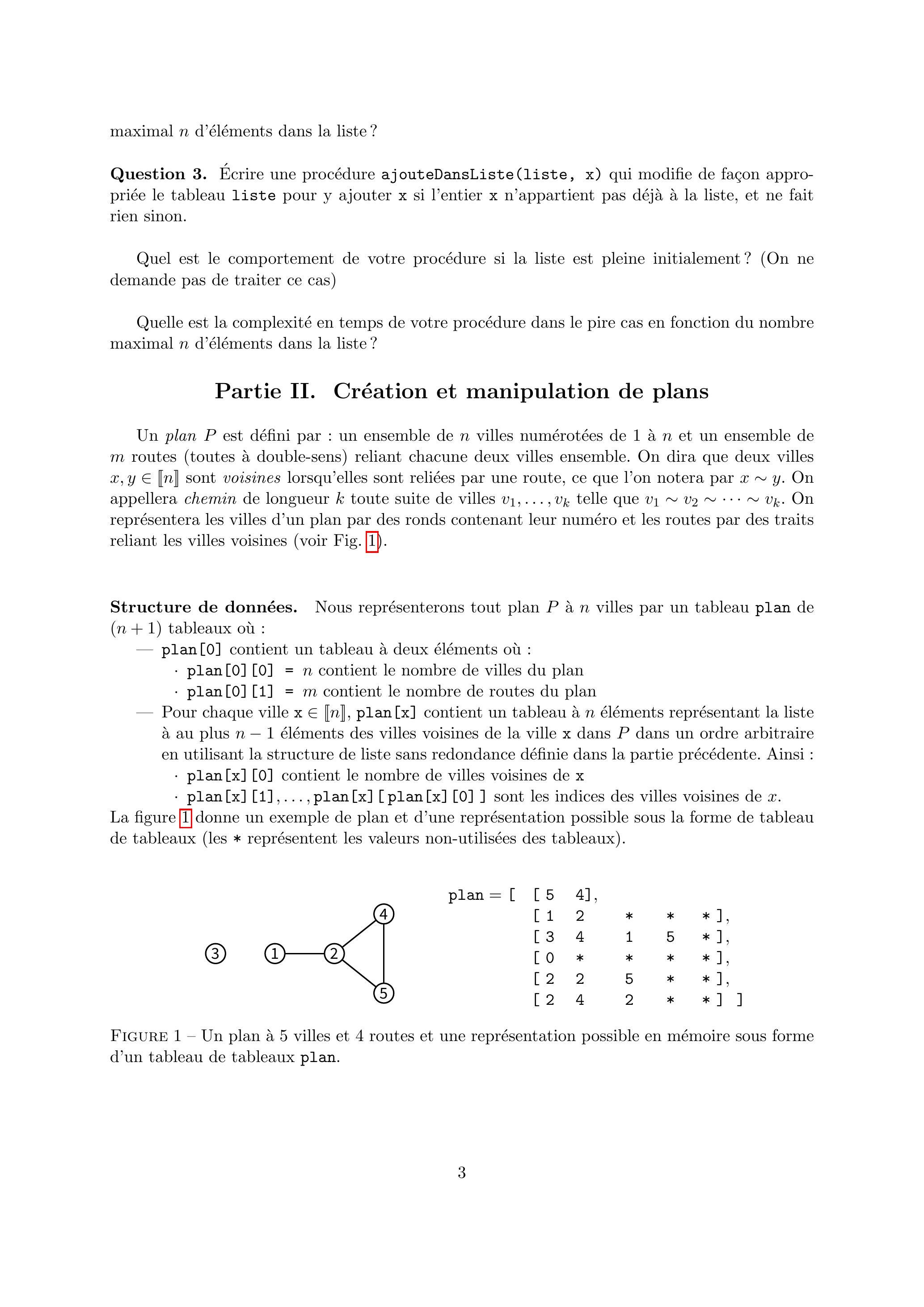 Un plan est défini par : un ensemble de villes numérotées de 1 à et un ensemble de routes (toutes à double-sens) reliant chacune deux villes ensemble. On dira que deux villes sont voisines lorsqu'elles sont reliées par une route, ce que l'on notera par . On appellera chemin de longueur toute suite de villes telle que . On représentera les villes d'un plan par des ronds contenant leur numéro et les routes par des traits reliant les villes voisines (voir Fig. 1 ).