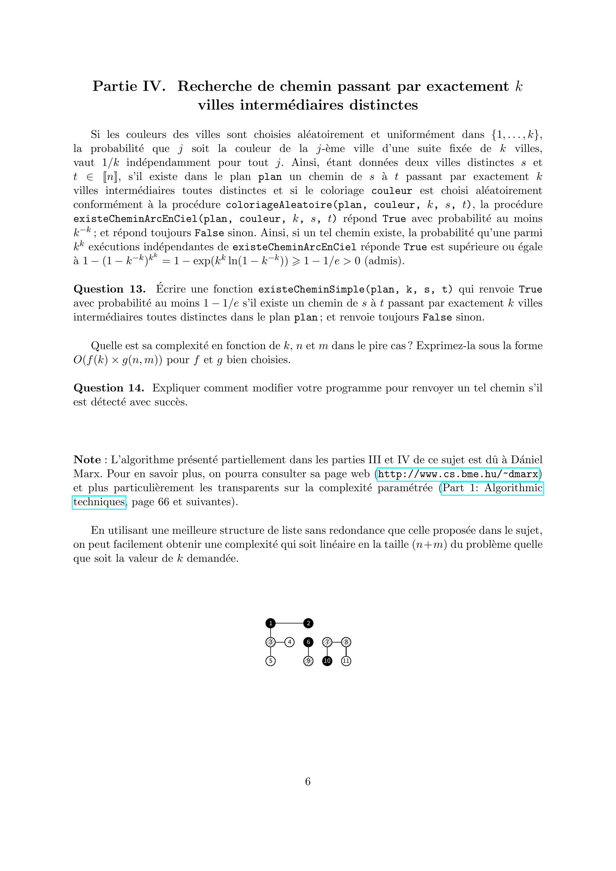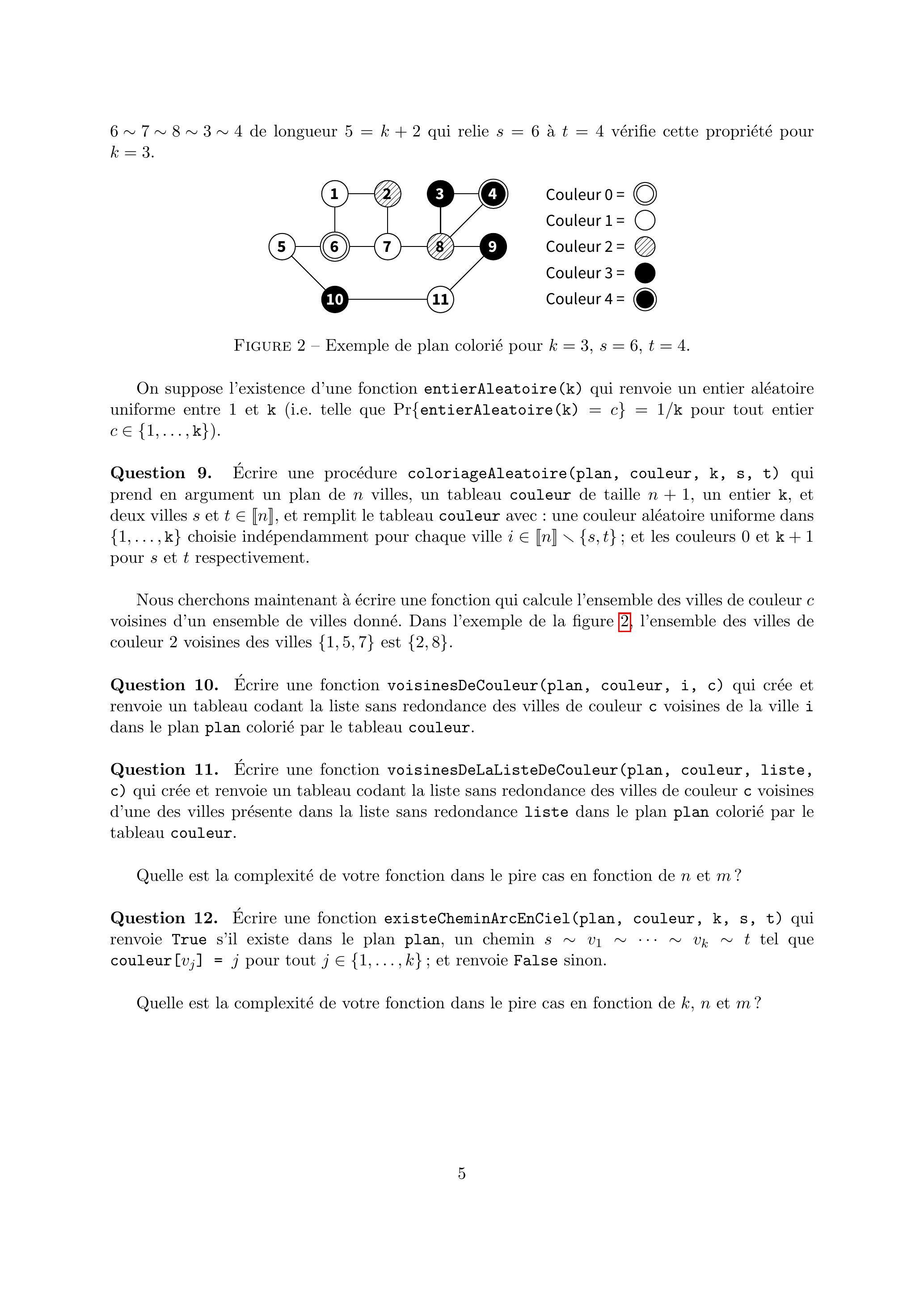 Le principe de l'algorithme est d'attribuer à chaque ville une couleur aléatoire codée par un entier aléatoire uniforme couleur stocké dans un tableau couleur de taille (la case 0 n'est pas utilisée). Les villes et reçoivent respectivement les couleurs spéciales 0 et , i.e. couleur et couleur . L'objectif de cette partie est d'écrire une procédure qui détermine s'il existe un chemin de longueur allant de à dont la -ème ville intermédiaire a reçu la couleur . Dans l'exemple de la figure 2 , le chemin de longueur qui relie à vérifie cette propriété pour .