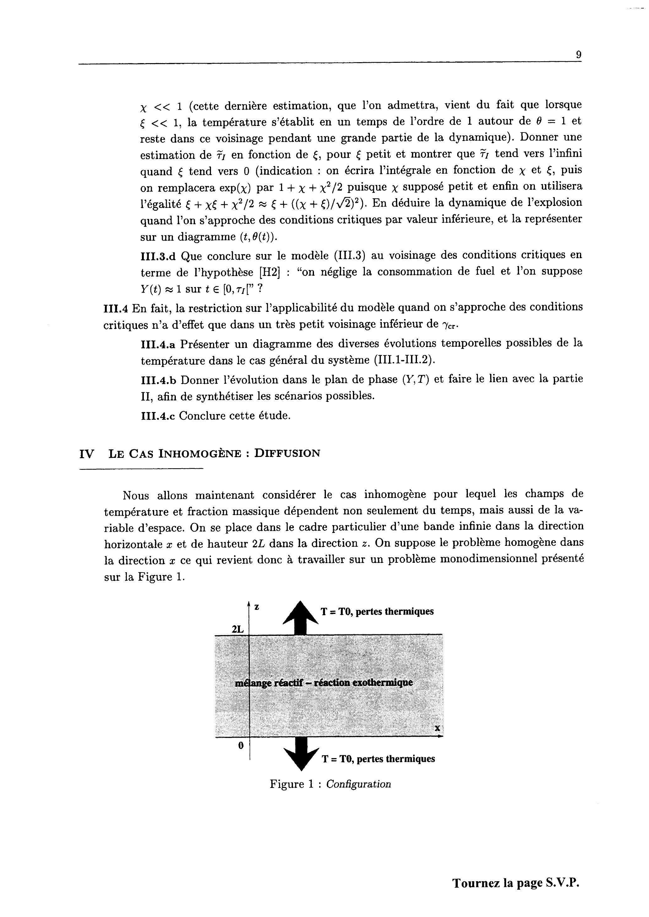 Le but du problème I est d'introduire ces théories et de saisir les mécanismes de base de couplage entre le terme source thermique issu de la réaction chimique, la conduction thermique et les pertes thermiques au bord des domaines considérés. Le but est d'obtenir les conditions critiques d'explosion, i.e. les valeurs limites de certains paramètres qui déterminent si le phénomène d'explosion a lieu ou non. Finalement, le dernier point que nous aborderons sera le couplage entre l'explosion thermique et la convection naturelle en présence du champ de gravitation. Ces études sont importantes et trouvent de nombreuses applications dans la détermination des conditions de sécurité pour le stockage de matières dangereuses.
