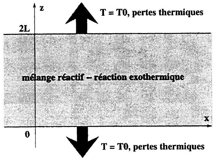 Nous allons maintenant considérer le cas inhomogène pour lequel les champs de température et fraction massique dépendent non seulement du temps, mais aussi de la variable d'espace. On se place dans le cadre particulier d'une bande infinie dans la direction horizontale et de hauteur dans la direction . On suppose le problème homogène dans la direction ce qui revient donc à travailler sur un problème monodimensionnel présenté sur la Figure 1.
