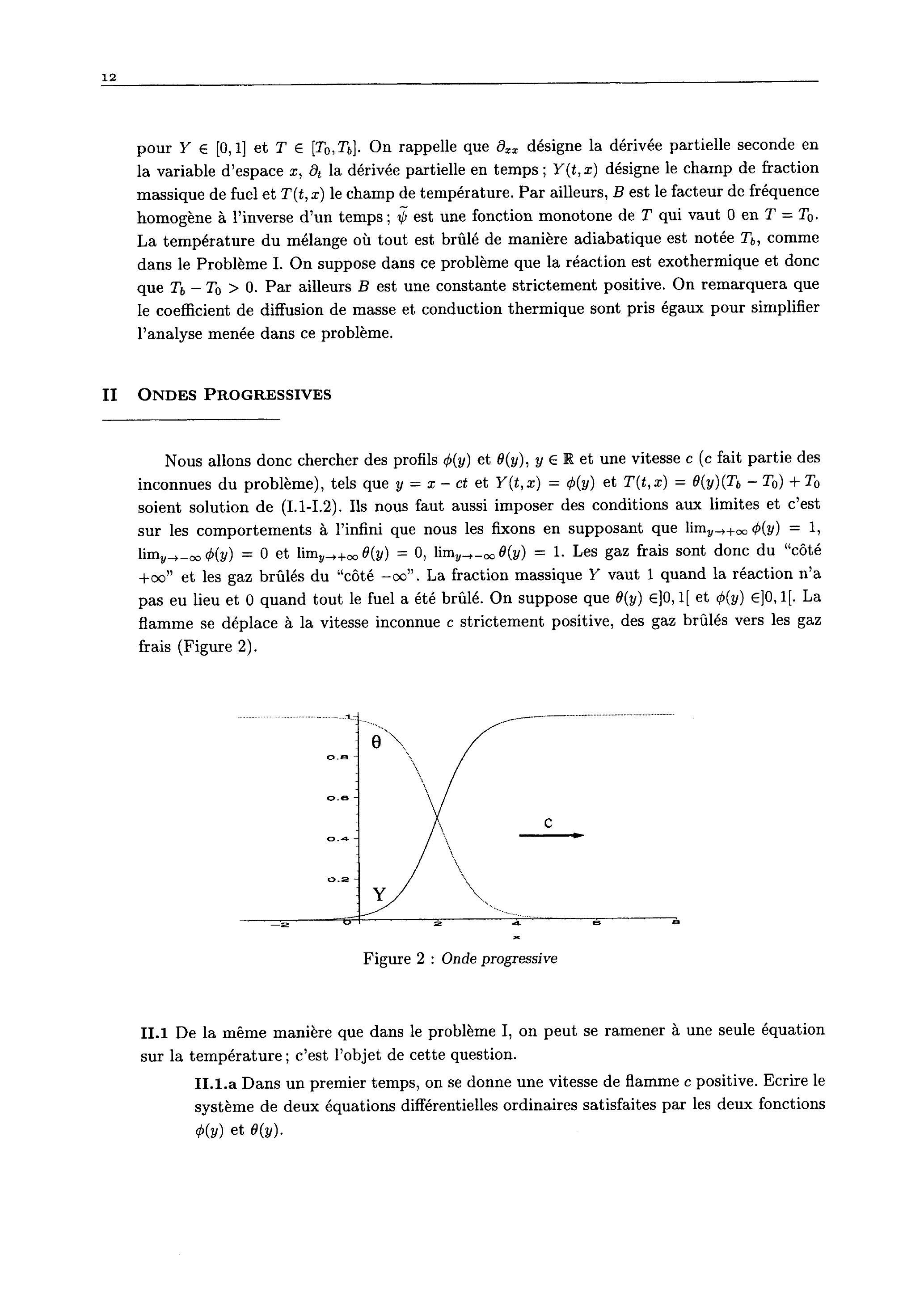 pour et . On rappelle que désigne la dérivée partielle seconde en la variable d'espace la dérivée partielle en temps; désigne le champ de fraction massique de fuel et le champ de température. Par ailleurs, est le facteur de fréquence homogène à l'inverse d'un temps; est une fonction monotone de qui vaut 0 en . La température du mélange où tout est brûlé de manière adiabatique est notée , comme dans le Problème I. On suppose dans ce problème que la réaction est exothermique et donc que . Par ailleurs est une constante strictement positive. On remarquera que le coefficient de diffusion de masse et conduction thermique sont pris égaux pour simplifier l'analyse menée dans ce problème.