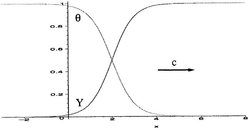 Nous allons donc chercher des profils et et une vitesse ( fait partie des inconnues du problème), tels que et et soient solution de (I.1-I.2). Ils nous faut aussi imposer des conditions aux limites et c'est sur les comportements à l'infini que nous les fixons en supposant que , et . Les gaz frais sont donc du "côté " et les gaz brûlés du "côté ". La fraction massique vaut 1 quand la réaction n'a pas eu lieu et 0 quand tout le fuel a été brûlé. On suppose que et . La flamme se déplace à la vitesse inconnue strictement positive, des gaz brûlés vers les gaz frais (Figure 2)