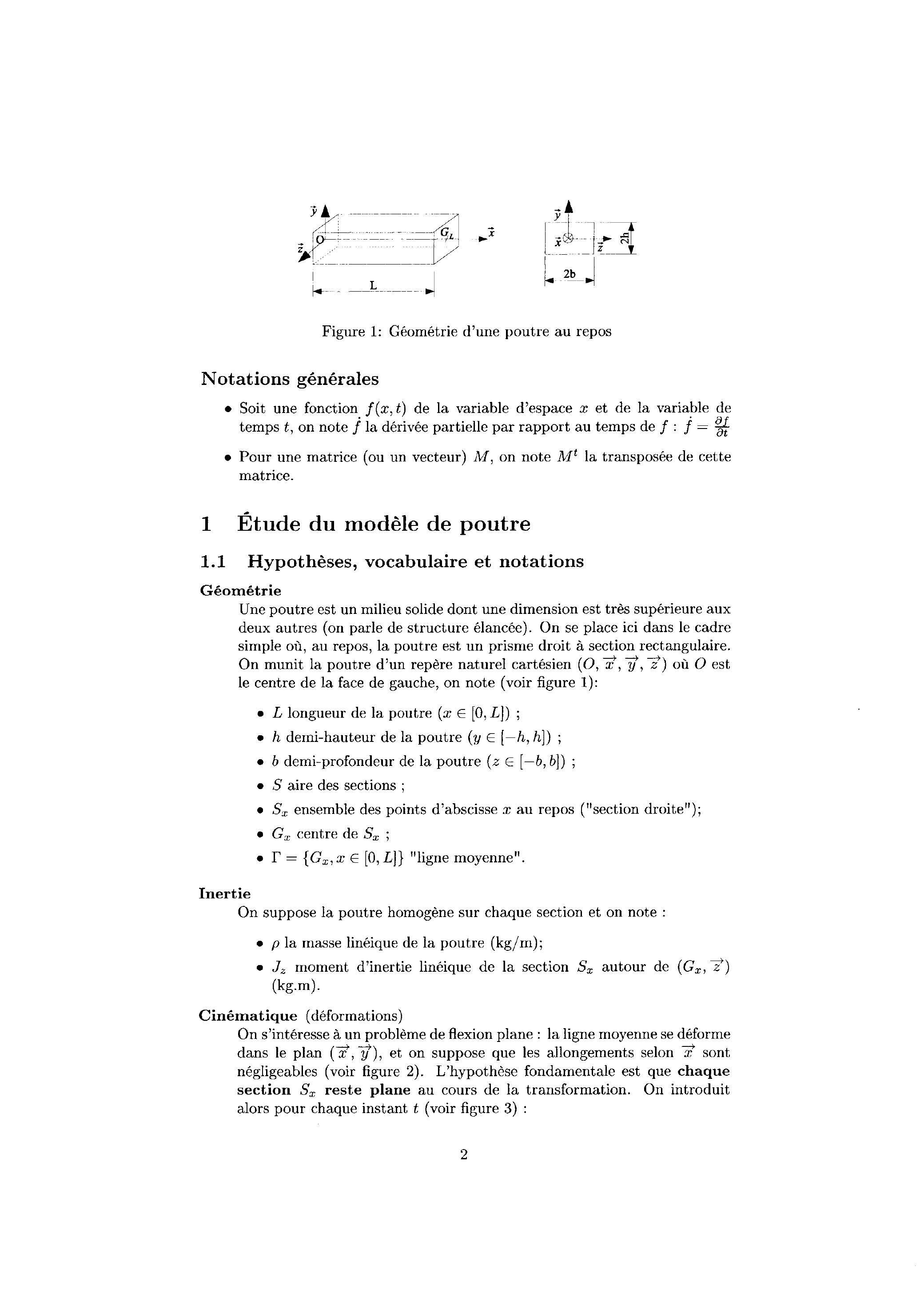 Une poutre est un milieu solide dont une dimension est très supérieure aux deux autres (on parle de structure élancée). On se place ici dans le cadre simple où, au repos, la poutre est un prisme droit à section rectangulaire. On munit la poutre d'un repère naturel cartésien ( ) où est le centre de la face de gauche, on note (voir figure 1):